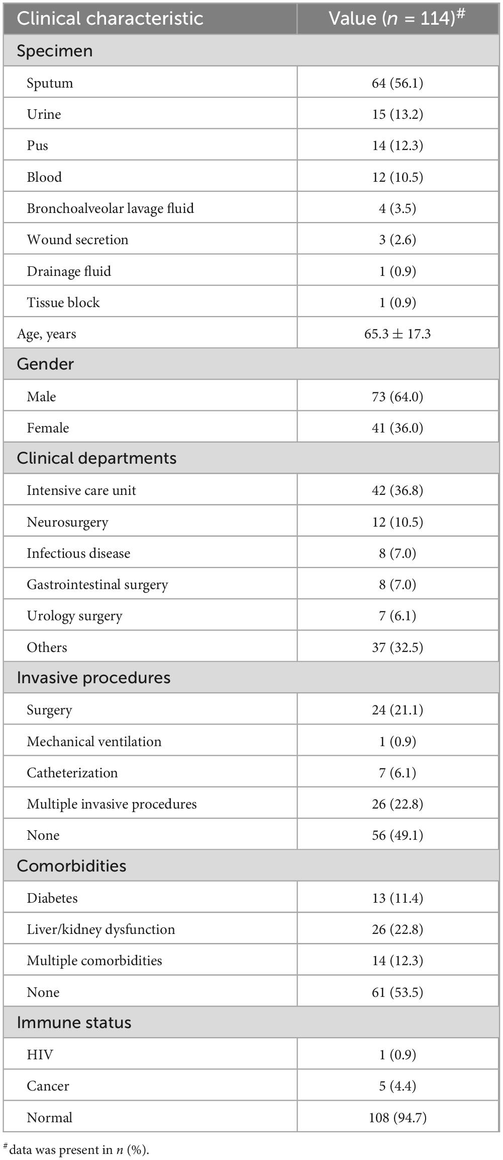 Table 1 provides a summary of the clinical characteristics. A total of 114 isolates were mainly cultured from sputum (56.1%, 64/114), followed by urine (13.2%, 15/114) and pus (12.3%, 14/114). Most of the patients were male (64.0%, 73/114) with a mean age of 65.3 ± 17.3 years. Of the K. pneumoniae isolates, 36.8% (42/114) were obtained from the intensive care unit (ICU). These findings were consistent with previous studies that older adults are at increased risk of K. pneumoniae infection, and that the ICU remains a major hotspot for K. pneumoniae detection. More than half (50.9%, 58/114) of the patients have undergone invasive procedures, such as surgery, mechanical ventilation, or catheterization, which are closely related to the risk of K. pneumoniae infection. In addition, nearly half (46.5%, 53/114) of the patients have underlying comorbidities (e.g., diabetes, liver/kidney dysfunction), and six patients were in an immunocompromised state with HIV or cancer.