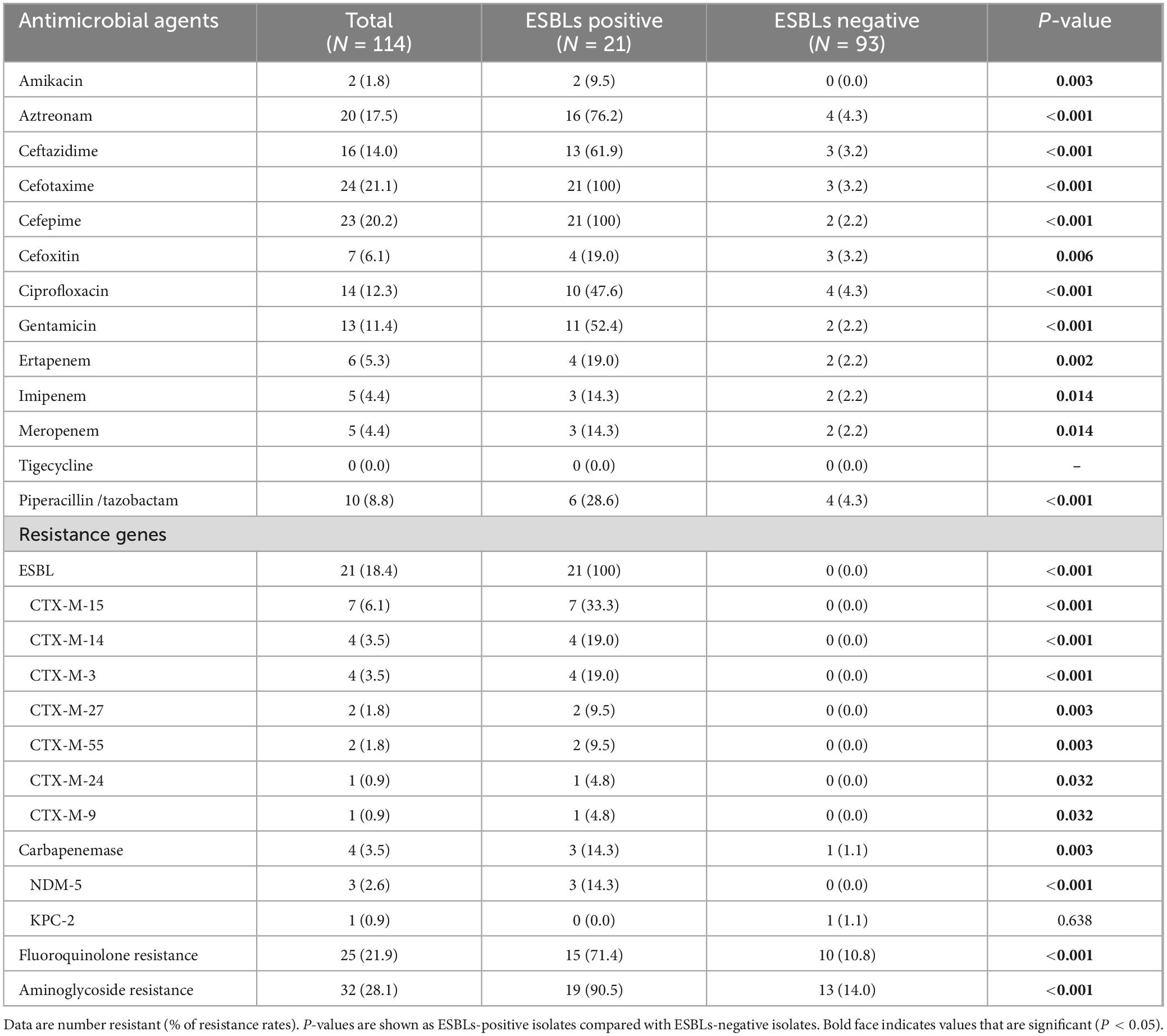 Among 114 K. pneumoniae isolates, the prevalence of MDR isolates was 12.3% (14/114). As shown in Table 2, ESBL-producing isolates exhibited significantly higher resistance rates to 12 tested antimicrobial agents, including amikacin, aztreonam, cefotaxime, cefoxitin, ceftazidime, cefepime, ciprofloxacin, gentamicin, ertapenem, imipenem, meropenem, and piperacillin/tazobactam, compared to ESBL-negative isolates. The resistance rate to ceftazidime, cefotaxime, and cefepime were 14.0%, 21.1%, and 20.2%, respectively, which is consistent with the finding that 18.4% (21/114) of the K. pneumoniae isolates carried ESBL genes. Among K. pneumoniae isolates carrying ESBLs, the blaCTX–M–15 type (n = 7) was the most prevalent, followed by blaCTX–M–14 (n = 4) and blaCTX–M–3 (n = 4). Of concern, 5.3% (6/114) of the K. pneumoniae isolates were identified as carbapenem-resistant. Resistance to ertapenem was observed in all six isolates, with five also exhibiting non-susceptibility to both meropenem and imipenem. Four of the six carbapenem-resistant isolates were identified as carbapenemase producers, including three harboring blaNDM–5 and one carrying blaKPC–2. Additionally, the resistance rate to ciprofloxacin, amikacin, and gentamicin were 12.3% (14/114), 1.8% (2/114), and 11.4% (13/114), respectively, while fluoroquinolone and aminoglycoside resistance genes were detected in 21.9% (25/114) and 28.1% (32/114) of the isolates, respectively, with qnrS1 (19/25) and strA/B (25/32) being the most prevalent. Notably, all K. pneumoniae isolates remained fully susceptible to tigecycline. The detailed phenotypic profile of antimicrobial resistance was shown in Figure 1, and the detailed genotypic profile of antimicrobial resistance was listed in Supplementary Table 1. Most of the OmpK35 were intact, and only five isolates (4.4%, 5/114) harbored truncated OmpK35 (Figure 1 and Supplementary Table 1).