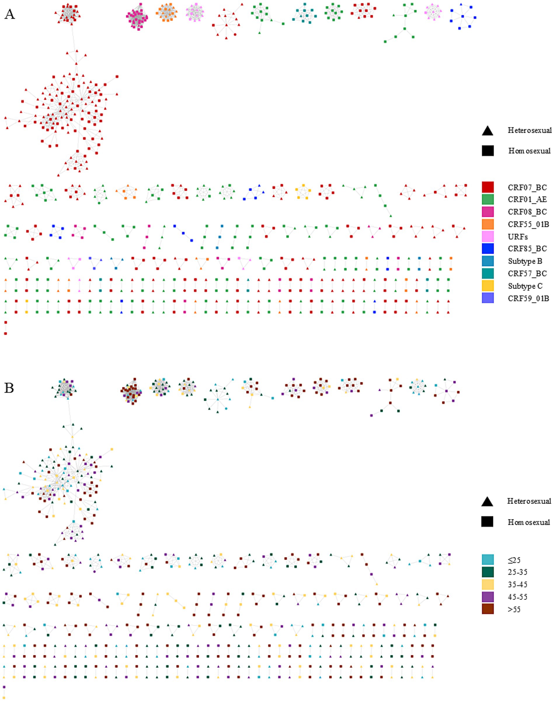 Figure 1. Molecular transmission network of people living with HIV in Ningbo, China (2018–2022). Clusters are ordered by size within each panel. Node shapes denote distinct transmission routes, and node colors represent participant characteristics, including HIV-1 genotypes and age groups. (A) corresponds to the subtype distribution of the network. (B) represents the age distribution of the network.