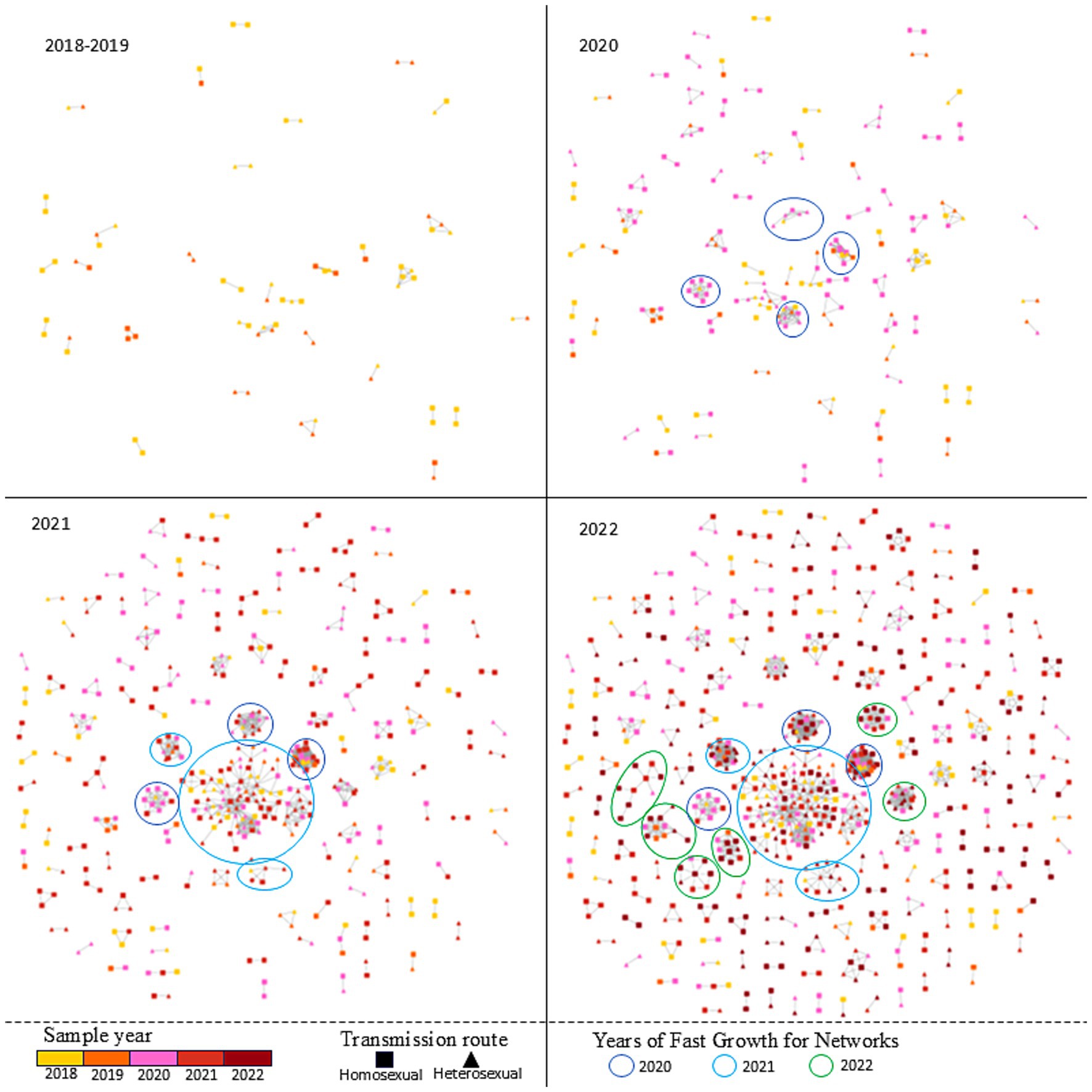 Figure 2. The temporal trends and Fast-growing clusters of HIV-1 transmission network in Ningbo (2018–2022).