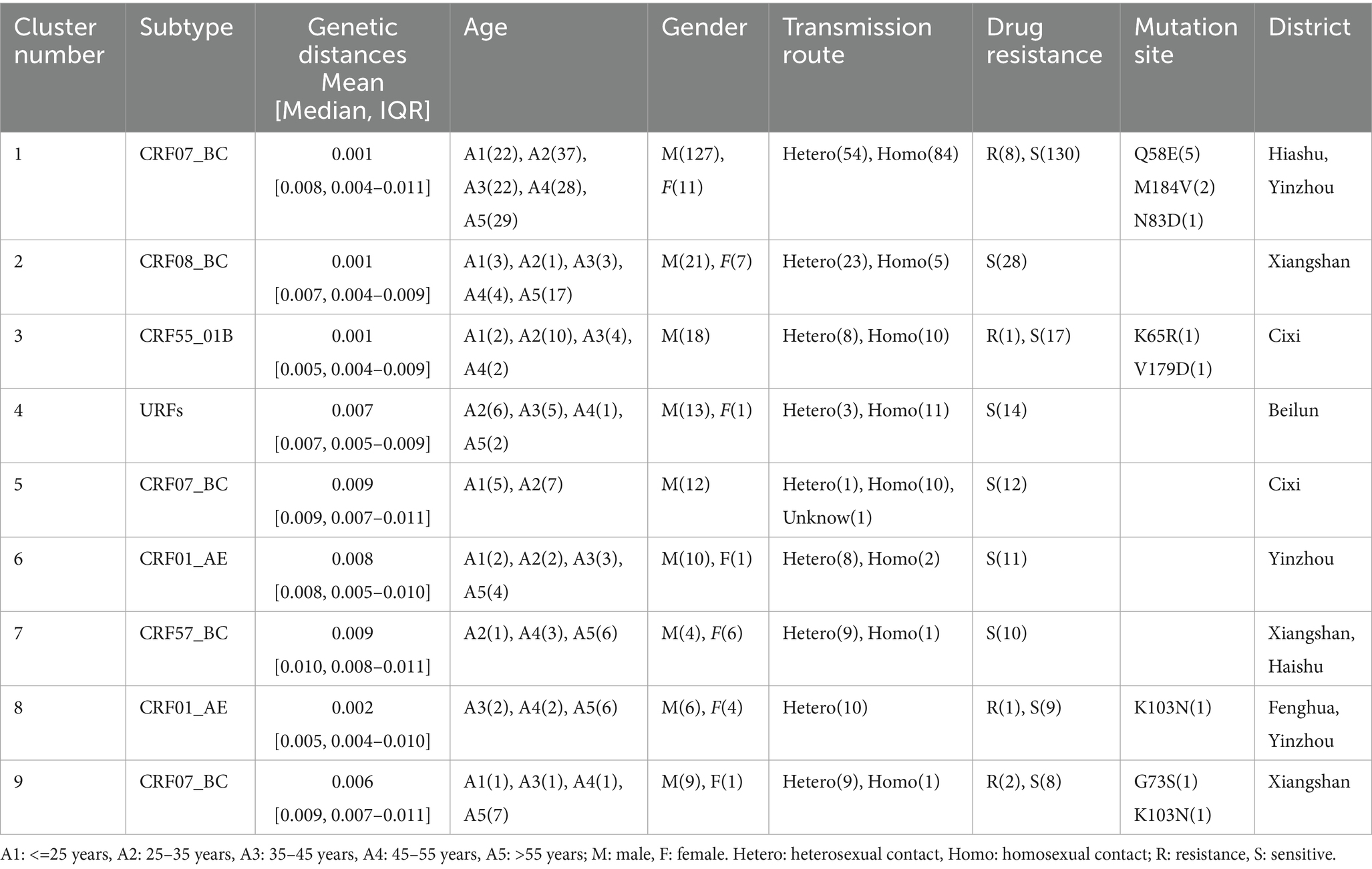Conclusion: This study elucidates the MTNs of HIV-1 in Ningbo, highlighting the role of subtype diversity and demographic traits in shaping transmission networks. Continuous monitoring of HIV-1 molecular subtypes among key populations may serve as feasible and focused prevention strategies to curb HIV transmission.