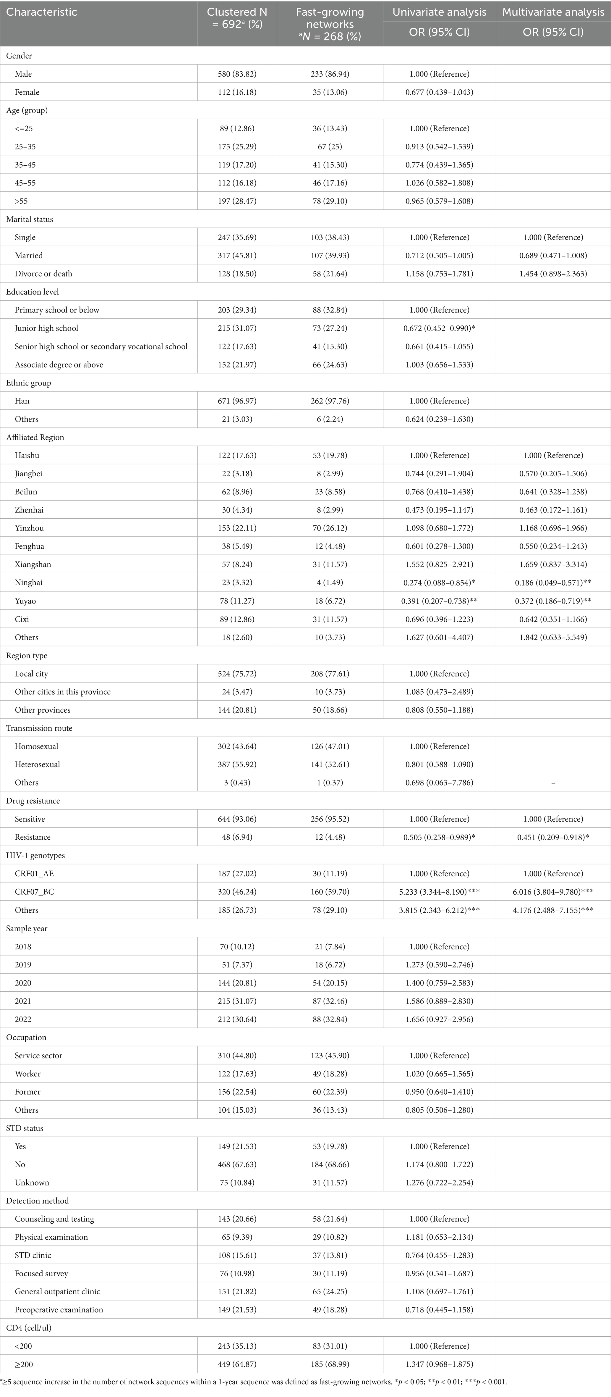Univariate and multivariate logistic regression models were used to compare sequences included in the transmission networks versus those not included. Results are presented in Figure 1; Supplementary Table S3. The multivariate analysis revealed that individuals aged >55 years were more likely to cluster compared with those aged ≤25 years [adjusted odds ratio (aOR) = 2.379, 95% confidence interval (CI) = 1.623–3.502, p < 0.001]. Compared with Han ethnic patients, those from other ethnic groups showed reduced odds of clustering (aOR = 0.494, 95% CI = 0.270–0.873, p = 0.018). Patients with CD4 counts >200 cells/μL exhibited higher odds of clustering than those with CD4 ≤ 200 cells/μL (aOR = 1.295, 95% CI = 1.023–1.641, p = 0.032). Temporally, cases diagnosed in 2020 (aOR = 1.571, 95% CI = 1.055–2.349, p = 0.027) and 2021 (aOR = 1.765, 95% CI = 1.208–2.589, p = 0.003) exhibited higher odds of being part of transmission clusters compared to 2018. In contrast, 2022 showed no statistically significant difference in clustering odds relative to 2018 (aOR = 1.242, 95% CI = 0.856–1.809, p = 0.256). Regarding viral genotypes, CRF07_BC (aOR = 1.806, 95% CI = 1.395–2.342, p < 0.001) and others (aOR = 1.577, 95% CI = 1.177–2.115, p = 0.002) showed stronger clustering tendencies than CRF01_AE.