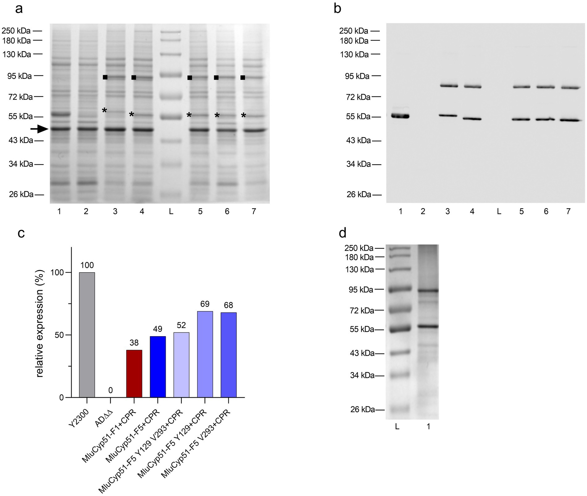 Figure 1. Verification of heterologous protein expression by SDS-PAGE and Western blot. (a) SDS-PAGE analysis of the host AD∆∆ strain, positive control, and recombinant strains expressing MluCyp51 isoforms, MluCPR, and MluCyp51-F5 variants co-expressed with CPR. Crude membranes were extracted from glucose-grown strains, and protein samples (10 μg) were separated on 8% acrylamide gels and stained with Coomassie Brilliant Blue R-250. Lane L: Protein Broad Range Standard, Lane 1: Y2300, Lane 2: AD∆∆, Lane 3: MluCyp51-F1 + CPR, Lane 4: MluCyp51-F5 + CPR, Lane 5: MluCyp51-F5 F129Y A293V + CPR, Lane 6: MluCyp51-F5 F129Y + CPR, Lane 7: MluCyp51-F5 A293V + CPR. The highly expressed tubulin-like protein (MW = 49 kDa, marked with an arrow) was used for normalization. The asterisk (*) indicates the recombinant Cyp51 isoform, and the square (■) marks the CPR. (b) Western blot analysis of control and recombinant strains. Bands correspond to MluCyp51 variants and CPR. (c) Relative protein expression levels of recombinant strain Cyp51 normalized to the control strain Y2300 and the tubulin-like protein. (d) SDS-PAGE after Ni-NTA affinity purification of MluCyp51-F5 + CPR. Recombinant protein bands expressed from the PDR5 and PDR15 loci were excised, and their identities were confirmed by nano LC-MS/MS analysis of trypsin-digested peptide fragments, achieving primary sequence coverages of 61–69% (Supplementary Table S4). The molecular weights of MluCyp51-F1 and MluCyp51-F5, based on their amino acid sequences (Supplementary Table S4), are 59.0 kDa, with MluCyp51-F1 migrating at ~60 kDa and MluCyp51-F5 at ~57 kDa on SDS-PAGE. The recombinant MluCPR exhibited a band with a relative molecular weight of 92 kDa, consistent with its calculated molecular weight of 81.8 kDa.