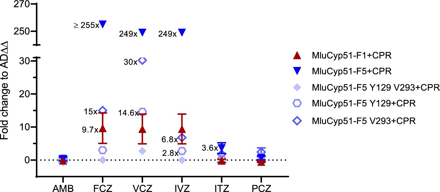 Bar chart showing fold change to ADΔΔ for various drugs: AMB, FCZ, VCZ, IVZ, ITZ, and PCZ. Symbols represent different enzyme variants: red triangles (MluCyp51-F1+CPR), blue triangles (MluCyp51-F5+CPR), blue diamonds (MluCyp51-F5 Y129 V293+CPR), purple diamonds (MluCyp51-F5 Y129+CPR), and blue circles (MluCyp51-F5 V293+CPR). FCZ, VCZ, IVZ, and ITZ show significant fold increases in certain variants, up to 255 times. Error bars indicate variability.