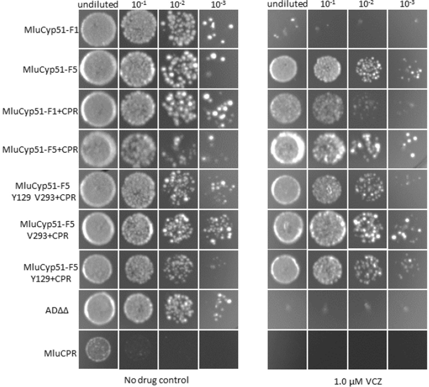 In a complementary experiment (see Figure 4), spot susceptibility assays were performed. Each strain grew in the control medium at all dilution steps, with single colonies observed at higher dilutions. The only exception was MluCPR, which only showed significant growth in the undiluted sample. However, as expected co-expression of MluCPR also enhanced growth for strains expressing MluCYP51-F1 and MluCYP51-F5 under VCZ exposure. When challenged with 1.0 μM VCZ, the MluCyp51-F5 variants grew at all dilution steps, but MluCyp51-F1(+CPR), AD∆∆, and MluCPR did not. Mutation of individual amino acids led to a partial growth in all dilution steps as expected from VCZ MIC values 1.43 μM (MluCyp51-F5 V293 + CPR) and 0.72 μM (MluCyp51-F5 Y129 + CPR), respectively. When both amino acids were modified in MluCyp51-F5 Y129 V293 + CPR, the susceptibility phenotype observed was the same as MluCyp51-F1 + CPR.