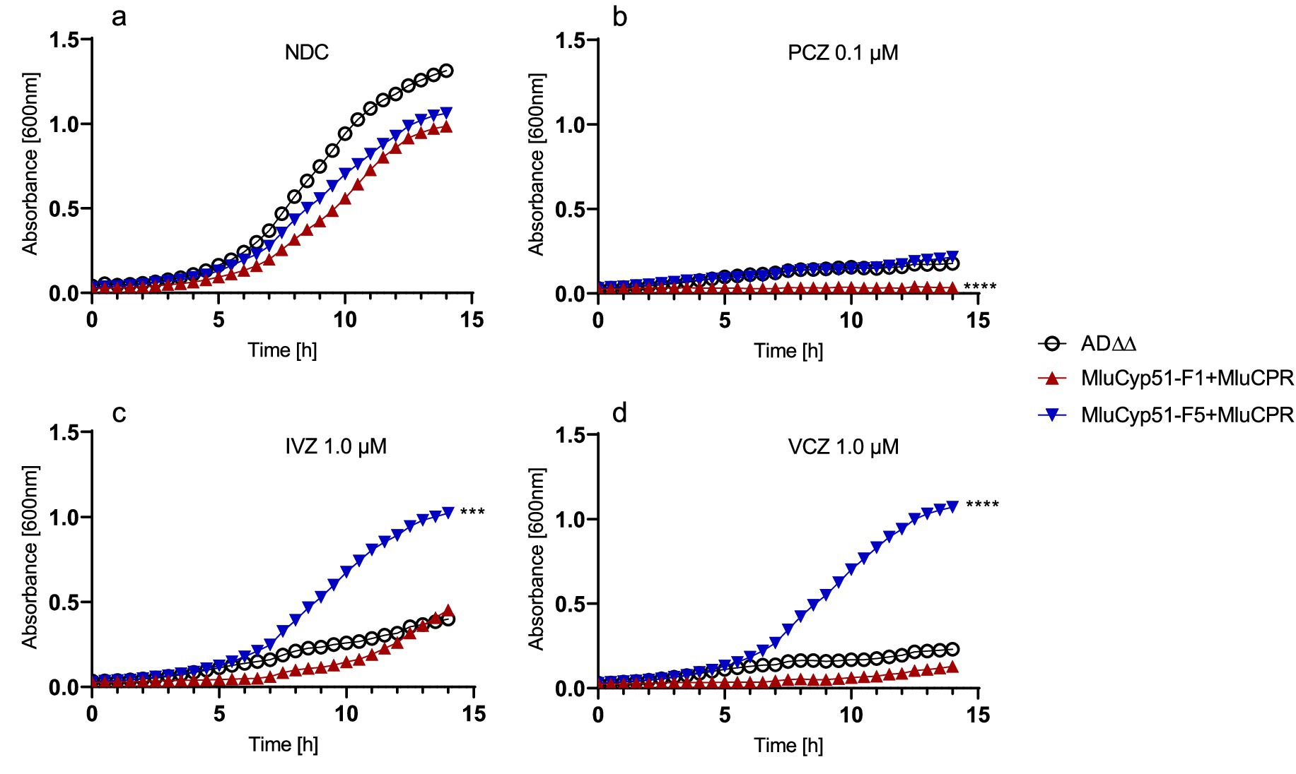 Figure 5. Growth curves of the host strain and strains expressing MluCyp51 isoforms with CPR. Media containing (a) no drug—NDC, (b) 0.1 μM PCZ, (c) 1.0 μM IVZ, and (d) 1.0 μM VCZ. Statistical analysis using one-way ANOVA and Dunnett’s post-hoc test. Significance levels according to Dunnett’s post-hoc test: p-value: *p < 0.0332, **p < 0.0021, ***p < 0.0002, and ****p < 0.0001, n = 3. NDC, no drug control. An overview of the strains and inserts is given in Supplementary Table S1.