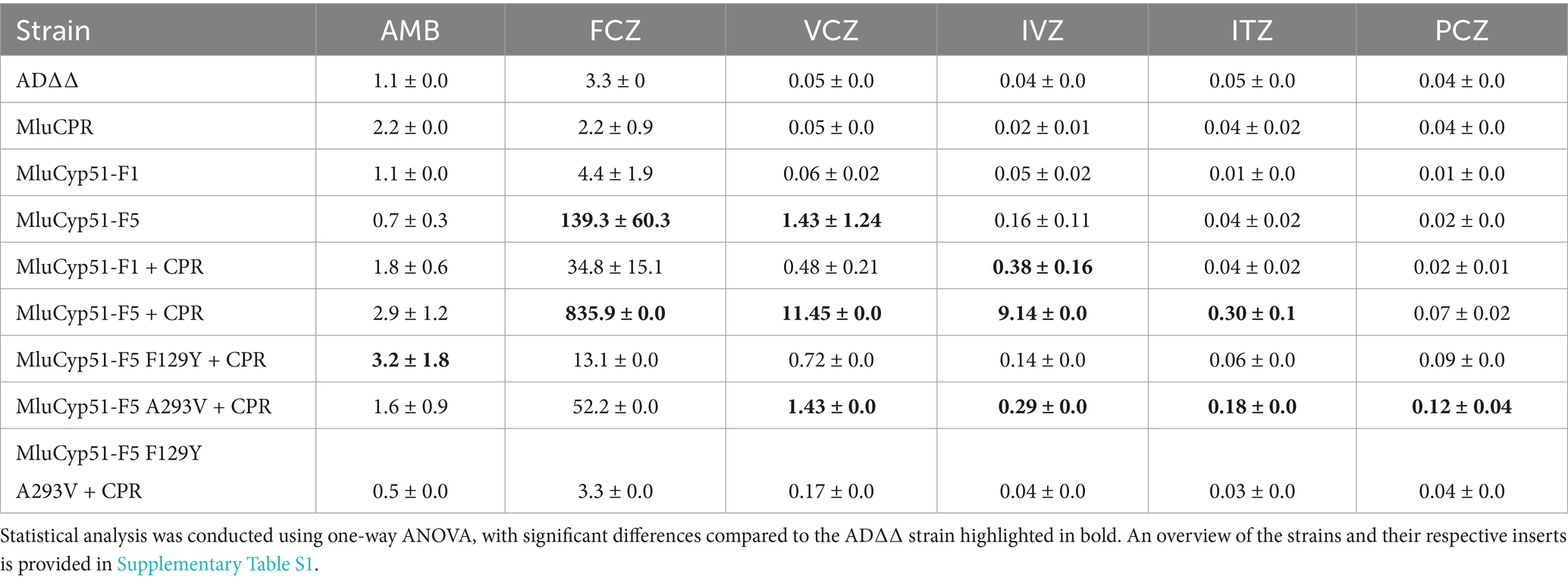 Table 1. Mean minimal inhibitory concentration (MIC) values (μM) and standard deviation of the heterologous S. cerevisiae strains overexpressing the respective MluCyp51 variants.