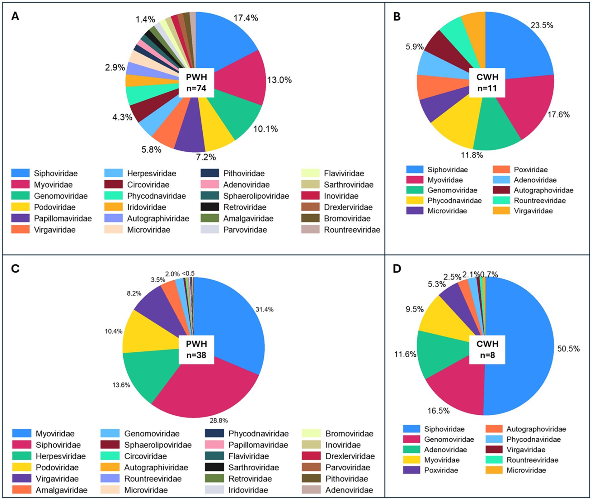 Figure 1. Prevalence and relative abundance of CSF viral families by HIV status. Panels (A,B) show the prevalence of viral families in the CSF (proportion of samples positive for each viral taxon among all the CSF samples) of PWH and CWH, respectively. Three families were found in about half of CSF samples from both PWH and CWH: Siphoviridae and Myoviridae (double-stranded DNA phages belonging to the order of Caudovirales), and Genomoviridae (single-stranded DNA viruses). Panels (C,D) show the relative abundance (number of reads of the specific taxon over the total number of reads per sample) of the viral families in virome-positive samples from PWH and CWH, respectively. Myoviridae and Siphoviridae represented the 60.2% of the total viral genomic material detected in the CSF of PWH, followed by Herpesviridae (13.6%, human double-stranded DNA viruses), Podoviridae (10.4%, double-stranded DNA phages belonging to the order of Caudovirales), Virgaviridae (single-stranded RNA viruses of plants), and 18 other viral families at much lower proportions. Siphoviridae contributed to the 50.5% of the total viral genomic material detected in the CSF of CWH, followed by Genomoviridae (16.5%), Adenoviridae (11.6%, human double-stranded DNA viruses), Myoviridae (9.5%), Poxviridae (5.3%, human double-stranded DNA viruses), and 5 other viral families at much lower proportions.