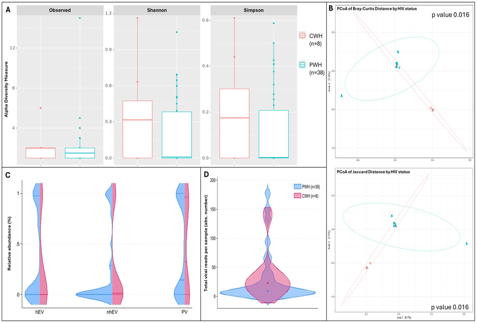Compared to CWH, αdiversity was lower in PWH: the number of observed taxa was 1.5 [0.0–2.0] vs. 2.0 [1.0–2.0] and Shannon index was 0.00 [0–0.36] vs. 0.32 [0–0.47], suggesting lower richness and less even distribution among taxa in PWH; Simpson index was 0.00 [0–0.14] vs. 0.17 [0–0.30], confirming the dominance of fewer taxa in the CSF of PWH. Although all indexes were consistently lower in PWH, the differences did not reach statistical significance (p > 0.05 for all, n = 38 vs. n = 8; Figure 2A). β diversity analysis showed significant divergence in the composition of viral communities between PWH and CWH (p = 0.016 for both the distance measures; Figure 2B); however, HIV status explained only the 3.3 and 3.4% (R2 of Jaccard and Bray Curtis distance, respectively) of the variation in viral composition. When the RA of each viral family and of PV, hEV, nhEV were compared by HIV status, no difference was detected (Figure 2C).