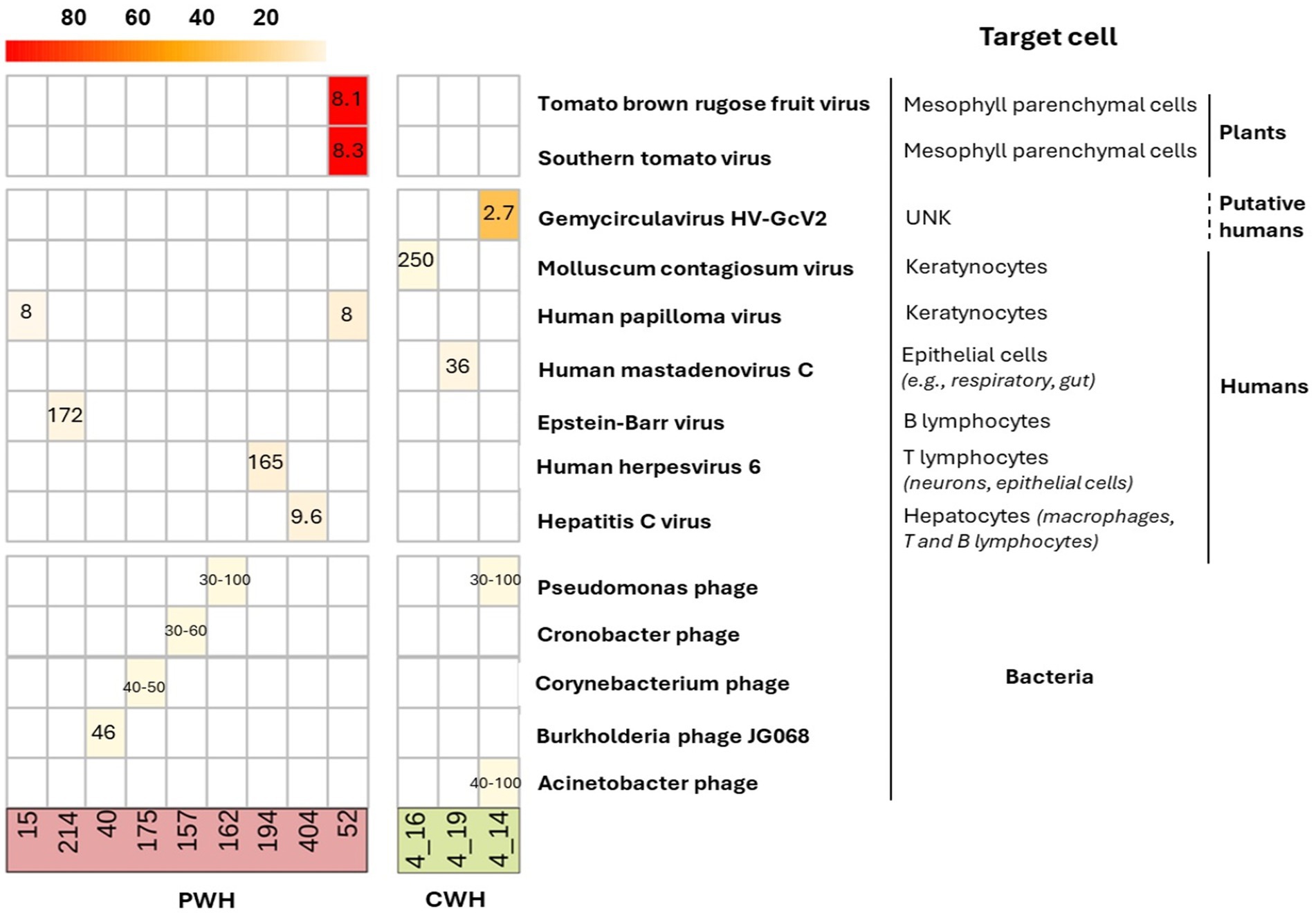 Contigs belonged to 8 unique hEV, 2 nhEV, and 6 unique PV (Figure 3). Among hEV, the dsDNA Herpesviridae family was represented by EBV and HHV-6 in one participant each, with 1,467 and 376 reads (genome coverage of 2.64 and 8.85%, respectively). HPV-12 and HPV-96 (in one participant each) were detected with 23 and 26 reads (genome coverage of 5.68 and 8.62%). The eukaryotic DNA viruses Poxviridae Molluscum Contagiosum virus, the Human Mastadenovirus C and the Gemycircularvirus HV-GcV2 were also detected in one CWH each (27, 23 and 64 reads, genome coverage of 0.16, 1.78, and 33.7%). HCV was the only eukaryotic RNA virus identified and found in one sample from PWH with 98 reads and a genome coverage of 8.03%. The 2 nhEV were both viruses affecting tomato plants and other solanaceous crops, Tomato Brown Rugose Fruit Virus and Southern Tomato Virus, both found in one PWH, and presenting the highest genome coverage (98.3 and 94.6% respectively).