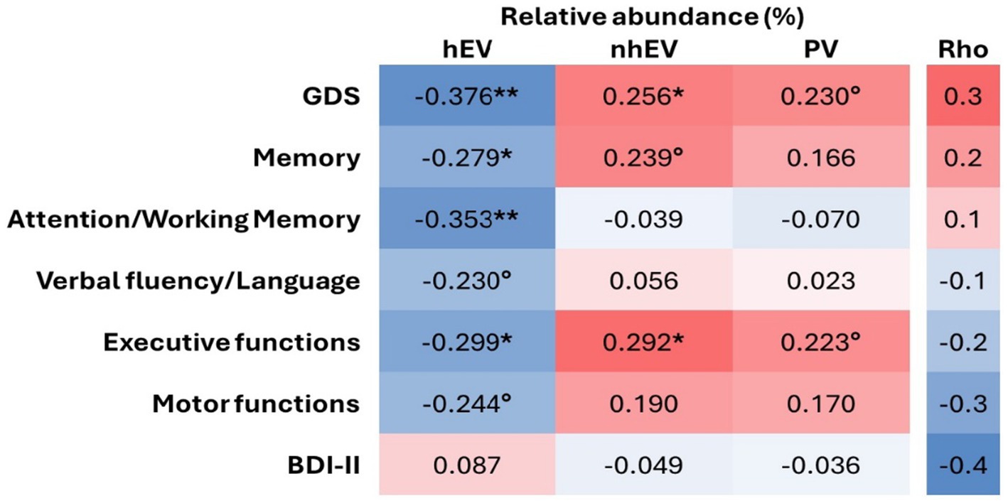 Figure 4. Heatmap of the correlations between relative abundance of CSF viral categories and neurocognitive measures. **p < 0.005; *p < 0.05; °p < 0.1 in n = 61 for cognitive metrics and n = 66 for BDI-II. hEV, human eukaryotic viruses; nhEV, non-human eukaryotic viruses; PV, prokaryotic viruses; GDS, Global Deficit Score; BDI-II, Beck Depression Inventory II.