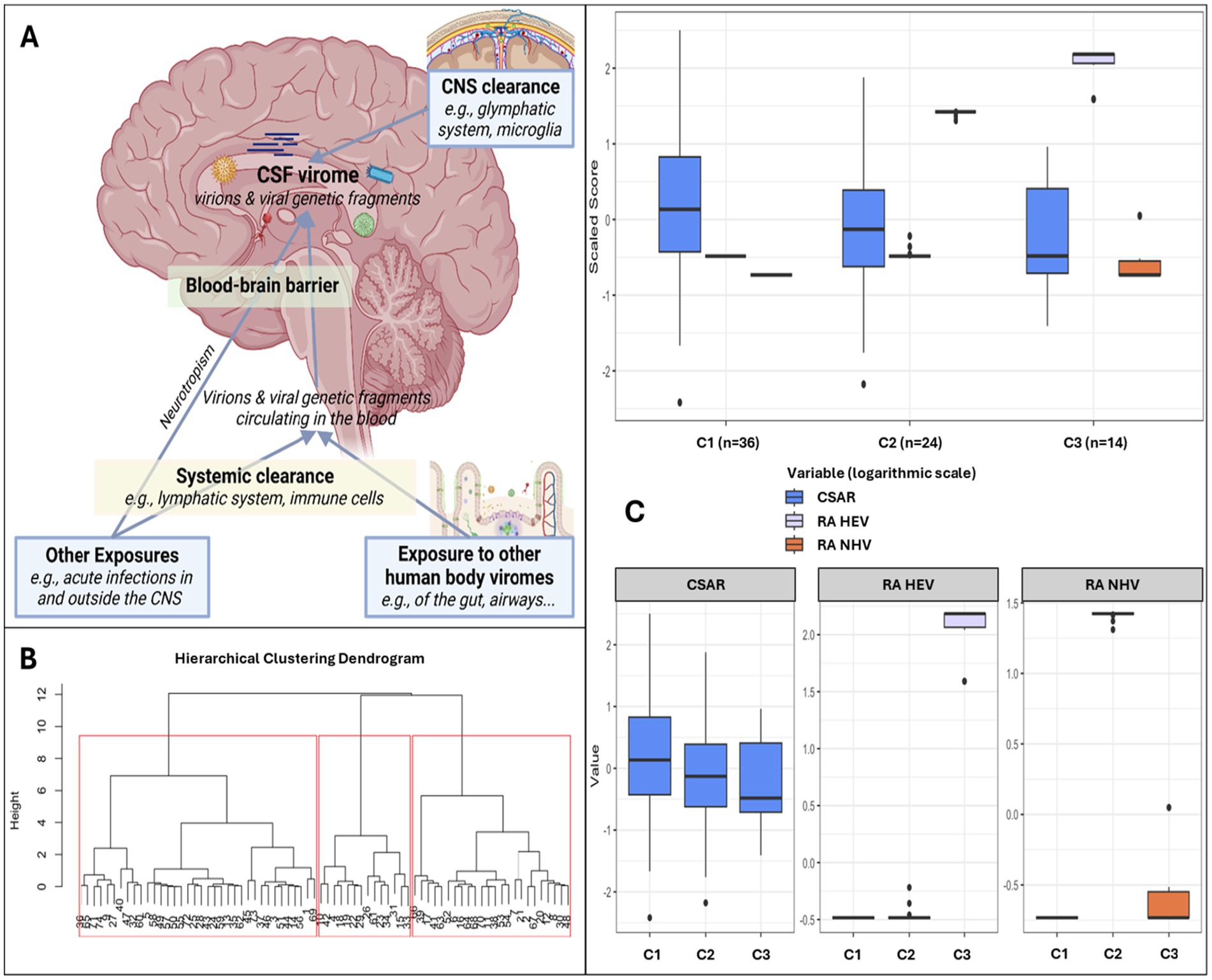 Figure 5. Clusters based on relative abundance of human and non-human CSF viruses and blood–brain barrier permeability. Panel (A) shows the hypothesis model: the human CSF virome is the collection of viral sequences that can come from both live virions and fragments of genomic material from death viruses. Part of the virome is generated within the CNS from viruses infecting resident or transiting cells (e.g., neurotropic viruses, viruses transported into the CNS by cells through trojan horse mechanisms), while part is represented by viral fragments that escape immune clearance and that originate from viruses that infect cells in blood and in other peripheral sites (e.g., gut, airways). These fragments eventually can enter the CNS as either free fragments (e.g., at the choroid plexus, through transcytosis, pinocytosis, or at leaking points along impaired BBB) or through trojan horse mechanisms (e.g., cells that phagocyted the fragment in the bloodstream and then migrated into the CNS). Therefore, the CSF virome (amount and type of viral sequences) will depend on a broad range of factors: e.g., spillover from the viromes of other body sites, ongoing viral infections, BBB permeability, peripheral immune clearance, and the clearance in the CNS operated by local cells and the glymphatic system. Within our study, the peripheral exposure, the systemic and the CNS clearance were unmeasured variables. Panel (B) shows the dendrogram for hierarchical clustering and the 3 clusters identified in red squares. Panel (C) shows the three clusters based on CSF-to-serum albumin ratio and relative abundance of human and non-human (prokaryotic and eukaryotic) viruses.