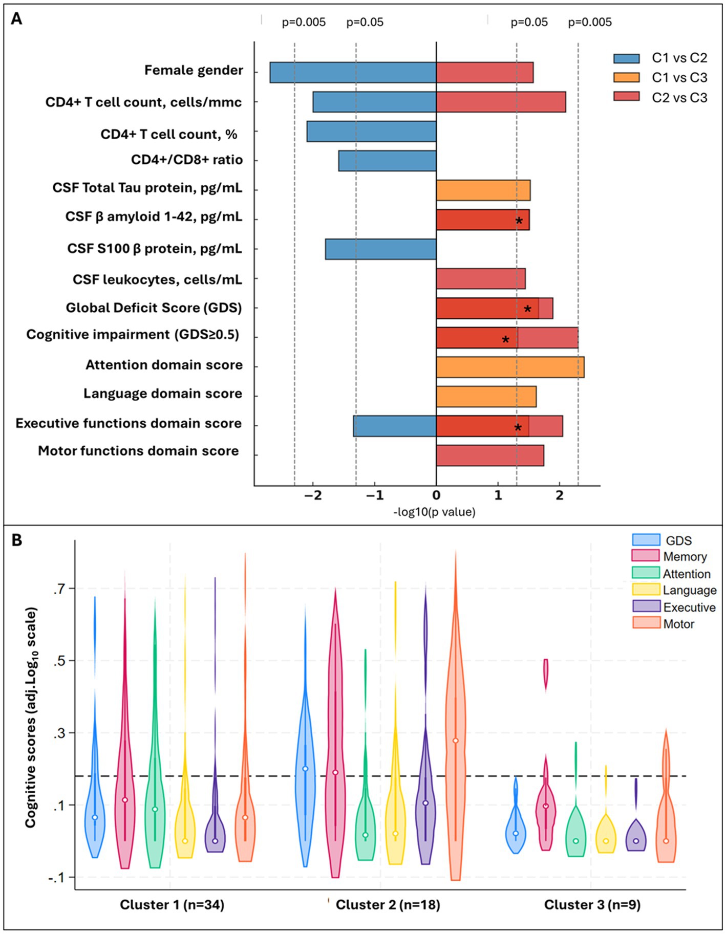 Figure 6. Significant differences between CSF clusters and Cognitive phenotypes of CSF clusters. Panel (A) shows demographic, CSF biomarkers and cognitive scores that significantly differ between clusters (pairwise comparisons with p < 0.05), with bar length proportional to −log10(p). Colors encode the comparison: blue = C1 vs. C2, orange = C1 vs. C3, red = C2 vs. C3. Bars extend right when the first cluster in the comparison has the higher value (e.g., C1 > C2 for blue) and left when the second cluster is higher. Four orange and red bars overlaid on the same side (C1 vs. C3 and C2 vs. C3 both significant in the same direction); for these, the segment appears deep red and is marked with an asterisk (*). Panel (B) shows violin plots for the Global and Domain Deficit Scores across the clusters; the dotted line cuts at 0.5, threshold to discriminate between impaired (above) and non-impaired cognitive performance (below).