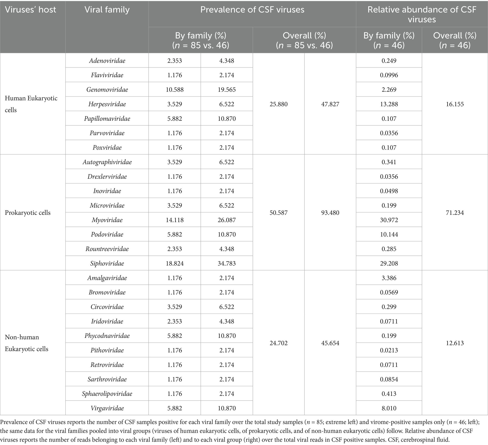 Prokaryotic viruses (PV) comprised 71.2% of all CSF viral reads and were detected in 93.5% of the positive samples (median 30 reads [5–86] per sample), as detailed in Table 1.