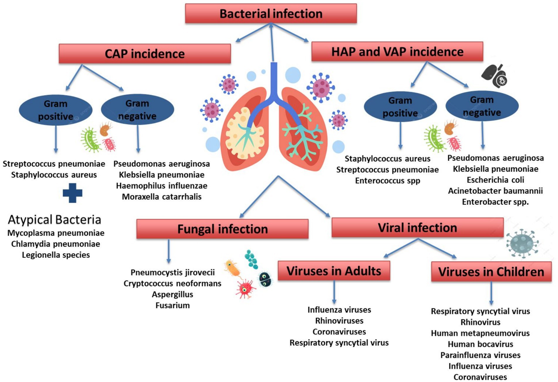 Understanding pneumonia classifications aids in diagnosis and treatment, as it can be caused by bacteria, viruses, and fungi (Figure 1). Since the prevalence of these causes varies by region, this review focuses on bacterial pneumonia. Common bacterial causes for CAP includes Gram-Positive Bacteria [i.e., Streptococcus pneumoniae (S. pneumoniae), Staphylococcus aureus (S. aureus)], Gram-Negative Bacteria [Pseudomonas aeruginosa (P. aeruginosa), Klebsiella pneumoniae (K. pneumoniae), Haemophilus influenzae (H. influenzae), Moraxella catarrhalis], and Atypical Bacteria [i.e., Mycoplasma pneumoniae (M. pneumoniae), Chlamydia pneumoniae (C. pneumoniae), Legionella species]. Furthermore, the bacterial cause for HAP and VAP includes Gram-Positive Bacteria (S. aureus, S. pneumoniae, Enterococcus spp.). Gram-Negative Bacteria [P. aeruginosa, K. pneumoniae, Escherichia coli (E. coli), Acinetobacter baumannii, Enterobacter spp.] (Jain et al., 2023).