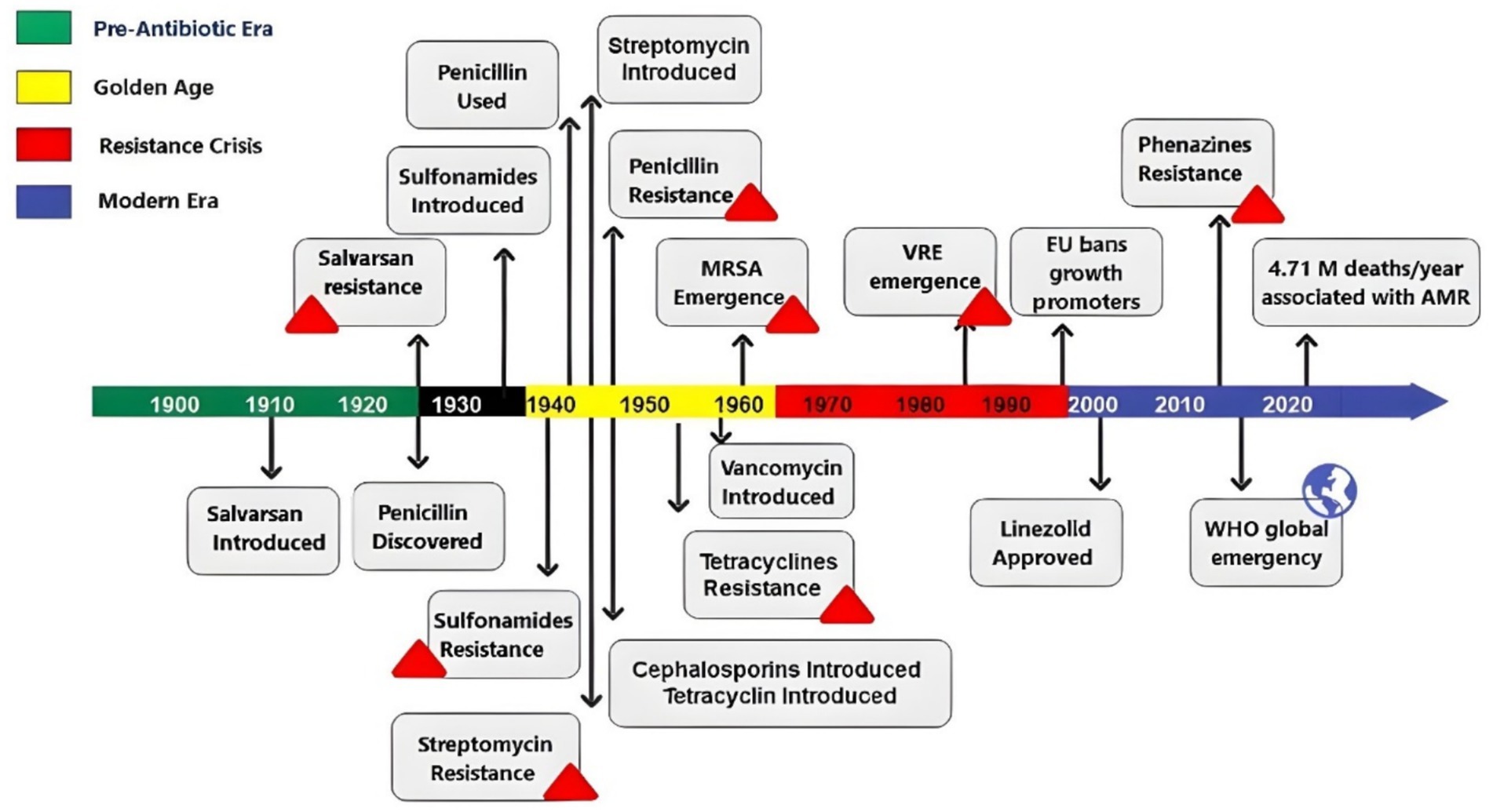The discovery of antibiotics revolutionized medicine, began with Alexander Fleming’s observation of penicillin in 1928. The true launch of the antibiotic era occurred in the 1940s, ushering in a golden age of drug discovery marked by the rapid development of most current antibiotic classes (Christensen, 2021). However, widespread use of antibiotics quickly resulted in the emergence of resistance—with penicillin resistance appeared just 4 years after its clinical introduction. Resistance to other antibiotics followed: tetracycline (introduced in 1945) saw resistance by 1953, and vancomycin (introduced in 1958) was followed by vancomycin-resistant enterococci (VRE) by 1988 (Hutchings et al., 2019; Stennett et al., 2022; Hunt and Kates, 2024). The rise of MD bacteria, including methicillin-resistant Staphylococcus aureus (MRSA), first identified in 1961, further deepened the crisis. Compounding the problem, antibiotics were also used extensively in agriculture—as growth promoters in livestock feed. This practice, which created selective pressure for resistant strains, prompted the European Union to ban antibiotic growth promoters in 1999 (Casewell et al., 2003). In 2021, this growing issue was linked to an estimated 4.71 million deaths globally due to bacterial AMR, with 1.14 million of these deaths being directly attributable to bacterial AMR (Naghavi et al., 2024; World Health Organization, 2024; World Health Organization, 2015). A timeline of antibiotic history and resistance is illustrated in Figure 2 (Hutchings et al., 2019; Stennett et al., 2022; Hunt and Kates, 2024; Naghavi et al., 2024).