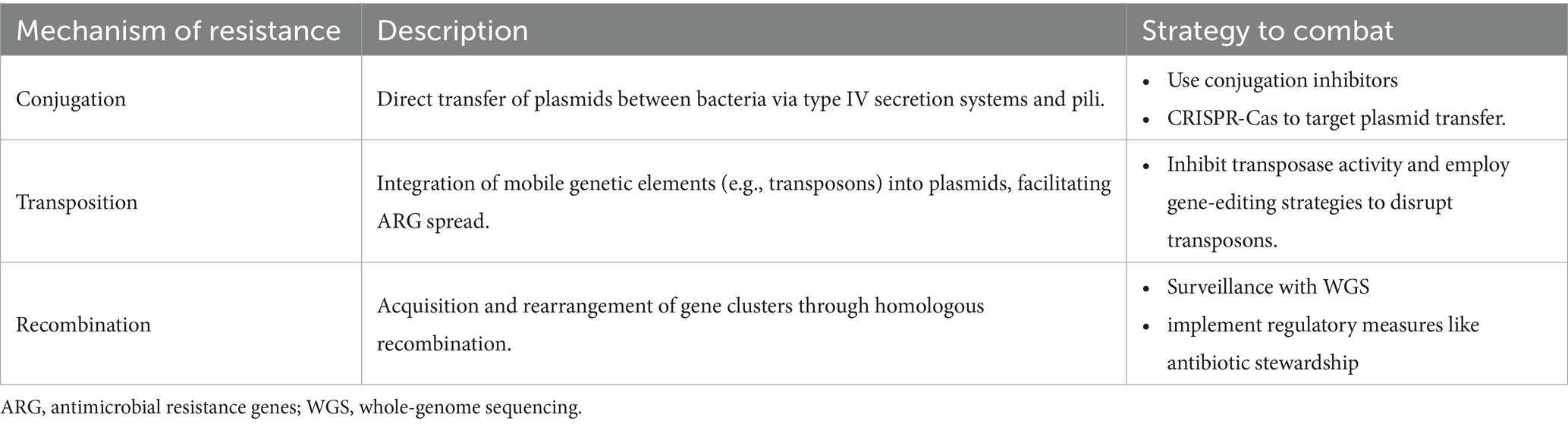 Several strategies have been proposed to address AMR by targeting plasmids and other mobile genetic elements through various methods, including CRISPR-Cas systems, conjugation inhibitors, and enhancing surveillance via whole-genome sequencing (WGS). CRISPR-Cas system, this is a gene editing tool that can specifically target and cleave DNA sequences that encode antibiotic resistance genes, demonstrating potential for controlling horizontal gene transfer and limiting the spread of antibiotic resistance (Fursova et al., 2022). Conjugation Inhibitors, Synthetic peptides are designed to disrupt plasmid transfer mechanisms and have shown promise in preventing the dissemination of resistance genes during bacterial infections (Svara and Rankin, 2011). Enhanced Surveillance, WGS and plasmid typing improve the ability to track the spread of resistance, aiding in timely interventions and informing antibiotic stewardship programs (Ajayi et al., 2024).