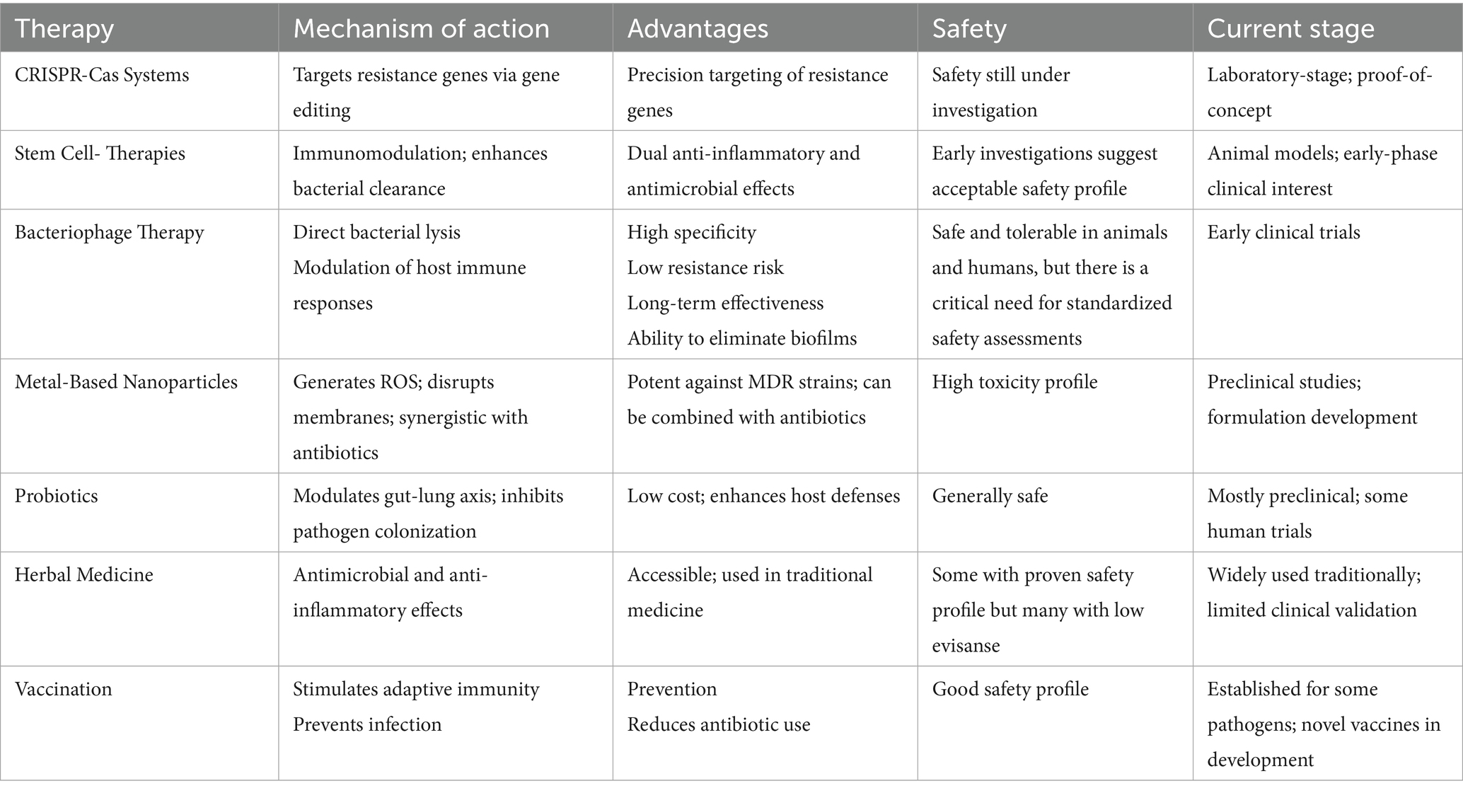 Results: Emerging strategies to tackle AMR in bacterial pneumonia involve several innovative approaches including stem cells, bacteriophage therapy, metal based nanoparticles (e.g., silver, copper, and gold). The adjunctive use of probiotics and herbal medicine has demonstrated potential in enhancing clinical outcomes and modulating host immunity. Moreover, gene editing technologies like CRISPR-CAS and various vaccination programs are being investigated for their roles in prevention and resistance management. While these methods show promise, many are still in the early stages of development and encounter challenges related to standardization, safety, and regulatory approval.