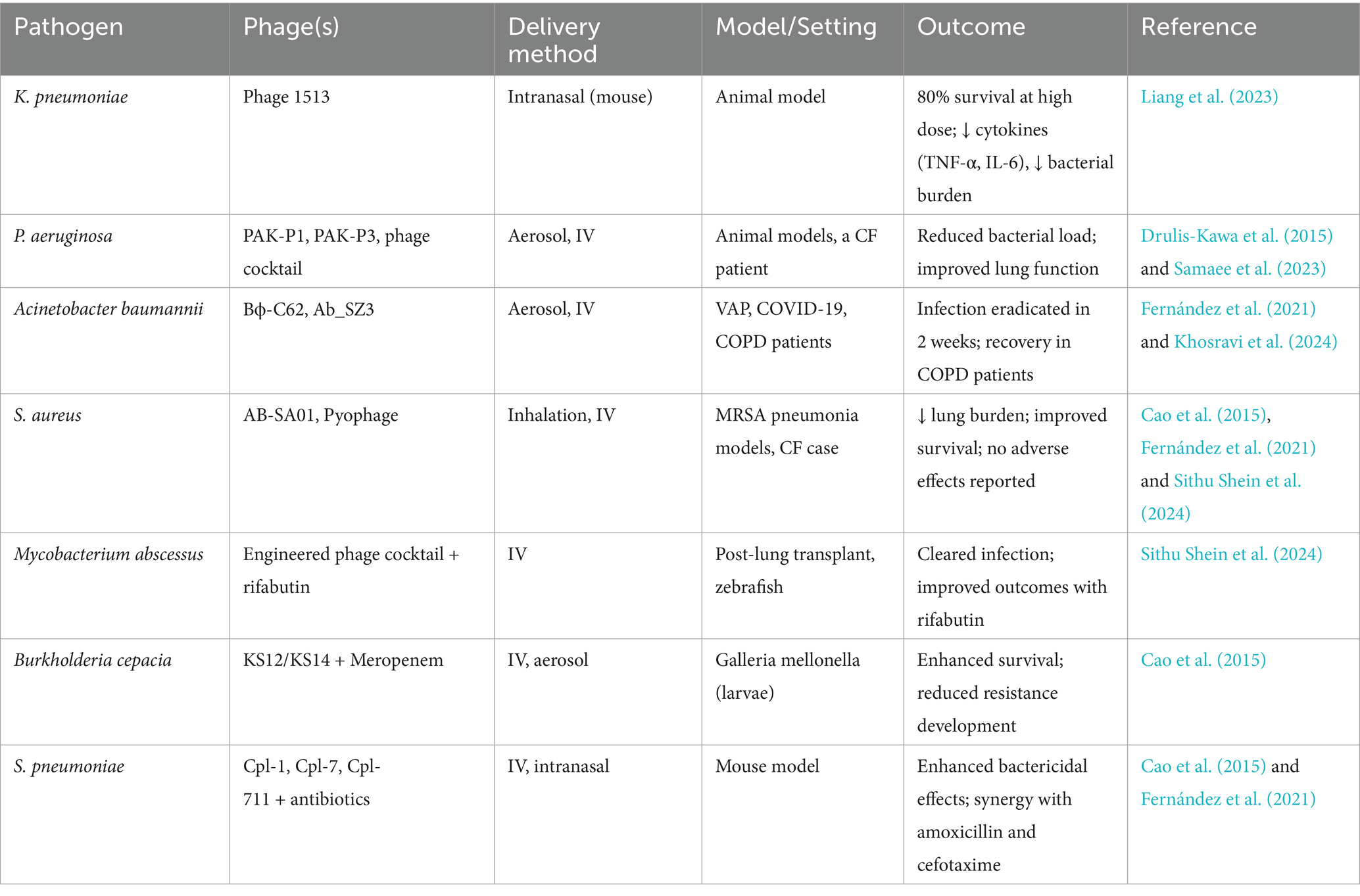 Phage therapy’s effectiveness in treating respiratory infections, validated by preclinical animal models. For example, Phage 1,513, which targets K. pneumoniae (KP 1513), proved more effective in mice when administered at higher doses. At a high dose of 2 × 109 PFU/mouse, phage 1513 attained an 80% survival rate, compared to 0% in the untreated control group. This was accompanied by reduced lung pathology, localized lesions, a decreased bacterial burden, and a significant reduction in pro-inflammatory cytokines such as TNF-α and IL-6 (p = 0.0159 and p = 0.0079, respectively) (Cao et al., 2015). Similarly, phages targeting S. aureus have shown greater efficacy than clindamycin in the treatment of MDR pneumonia in murine models. In VAP models, nebulized phages diminished bacterial loads and enhanced survival rates, both prophylactically and therapeutically (Fernández et al., 2021). Furthermore, phage-derived lytic enzymes, including endolysins Cpl-1, Cpl-7, and the engineered variant Cpl-711, exhibit significant bactericidal properties. These lysins significantly enhance the efficacy of antibiotics like amoxicillin or cefotaxime against S. pneumoniae and S. aureus in vivo (Fernández et al., 2021).