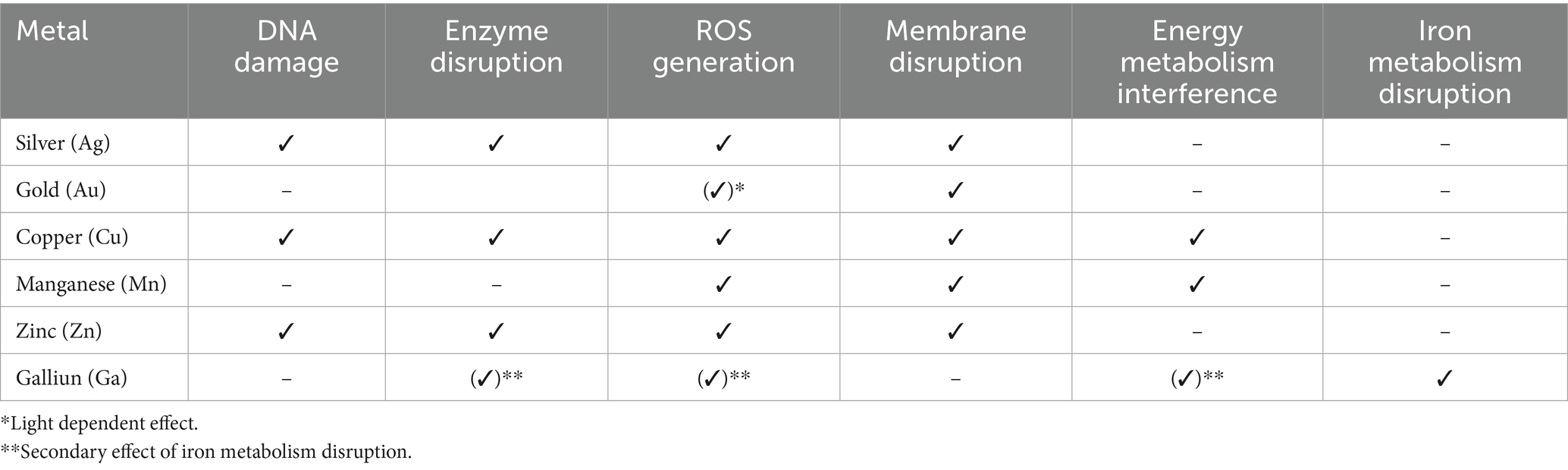 Metals are crucial for bacterial growth and homeostasis, but high concentrations can be lethal (Hood and Skaar, 2012). Metal compounds exhibit stronger antimicrobial effects than organic ones and could enhance antibiotic activity without fostering resistance (Frei et al., 2020; Laxminarayan et al., 2013). This strategy is not unprecedented, as historical applications reveal the use of silver as a wound antiseptic in the 18th and 19th centuries (Alexander, 2009). Key metals possess antimicrobial properties include (Mittapally et al., 2018) silver, zinc, gold, manganese, and copper, which are the focus of this review, detailing their mechanisms against bacteria (Table 4).