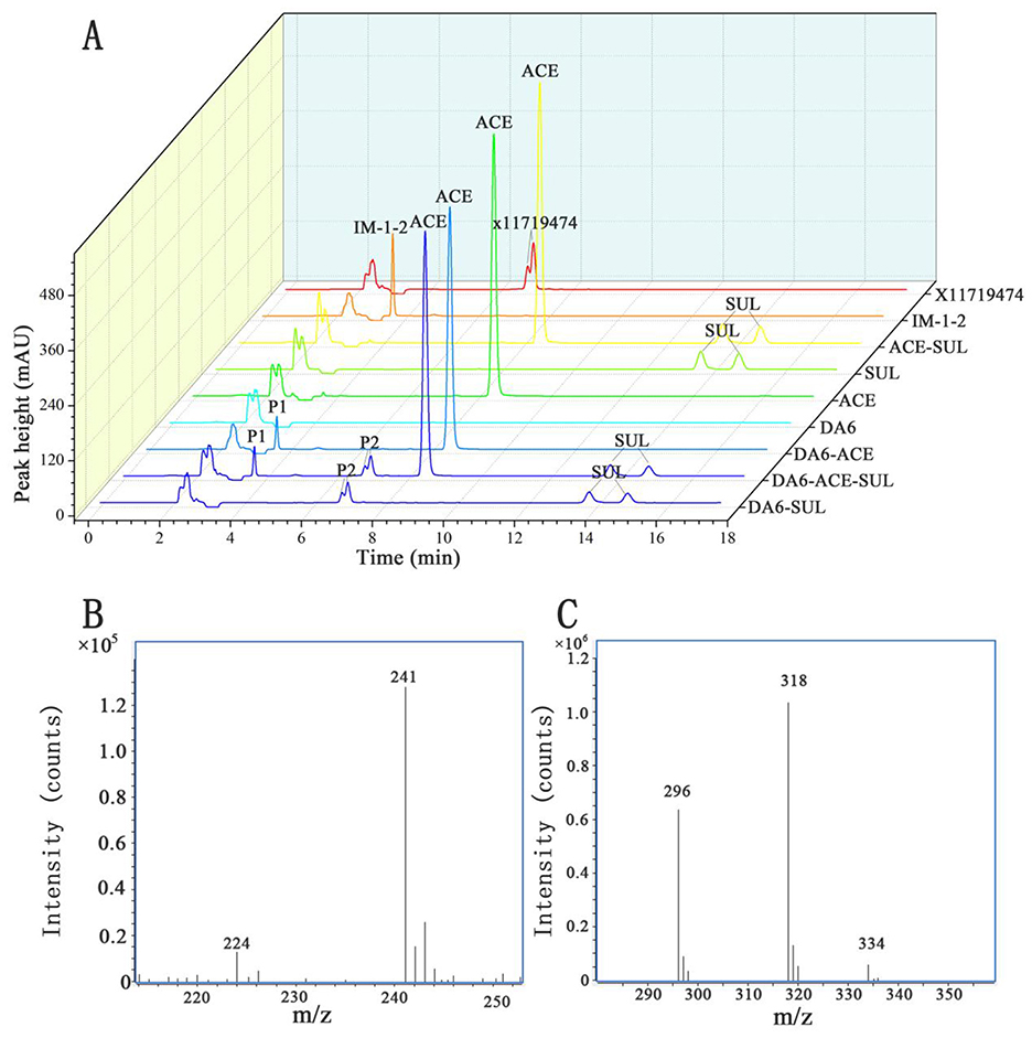 Figure 1. High-performance liquid chromatography (HPLC) and liquid chromatography-mass spectrometry (LC-MS) analysis of the metabolites produced during the degradation of ACE and SUL by the isolate DA6. (A) HPLC analysis of the transformation of ACE and SUL by the isolate DA6. (B) Positive-ion mode mass spectrometry analysis of the degradation product P1. (C) Positive-ion mode mass spectrometry analysis of the degradation product P2.