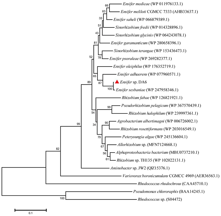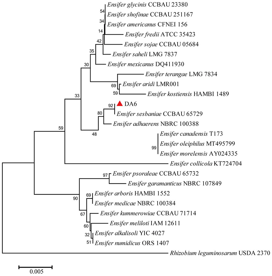 Figure 2. Phylogenetic tree of the isolate DA6. The phylogenetic tree was constructed using the neighbor-joining method, including other members of the genus Ensifer and representatives of other taxa, based on 16S rRNA gene sequence comparisons. Bootstrap percentages from 1,000 replicates are shown at the nodes. The sequence of Rhizobium leguminosarum USDA 2370 was used as the outgroup.