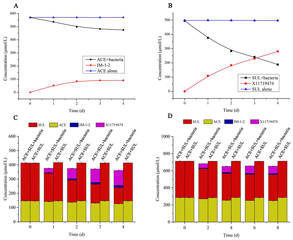 Four graphs labeled A, B, C, and D depict changes in concentration (micromoles per liter) over time in days. Graph A compares ACE with bacteria, IM-1-2, and ACE alone, showing slight concentration changes. Graph B compares SUL with bacteria, X11719474, and SUL alone, showing similar patterns. Graph C and D are bar charts displaying concentration breakdowns for ACE and SUL combinations with bacteria and other components over different time points, highlighting variations in proportions. Each graph indicates different treatments and their effects over time.