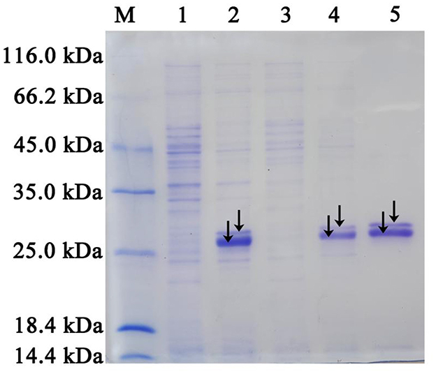 SDS-PAGE gel showing five lanes labeled M, 1, 2, 3, 4, and 5. Lane M contains molecular weight markers with bands at 14.4, 18.4, 25.0, 35.0, 45.0, 66.2, and 116.0 kilodaltons. Lanes 2, 4, and 5 display prominent bands near 25.0 kilodaltons, indicated by arrows.