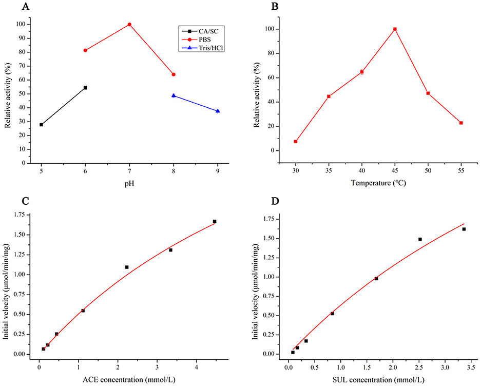 Figure 6. Enzymatic characterization and kinetic parameters of ACE and SUL degradation reactions catalyzed by the NHase. (A) Effects of pH on NHase activity. (B) Effects of temperature on NHase activity. (C) Kinetic parameters for the hydration of ACE degraded by the NHase. (D) Kinetic parameters for the hydration of SUL degraded by NHase.