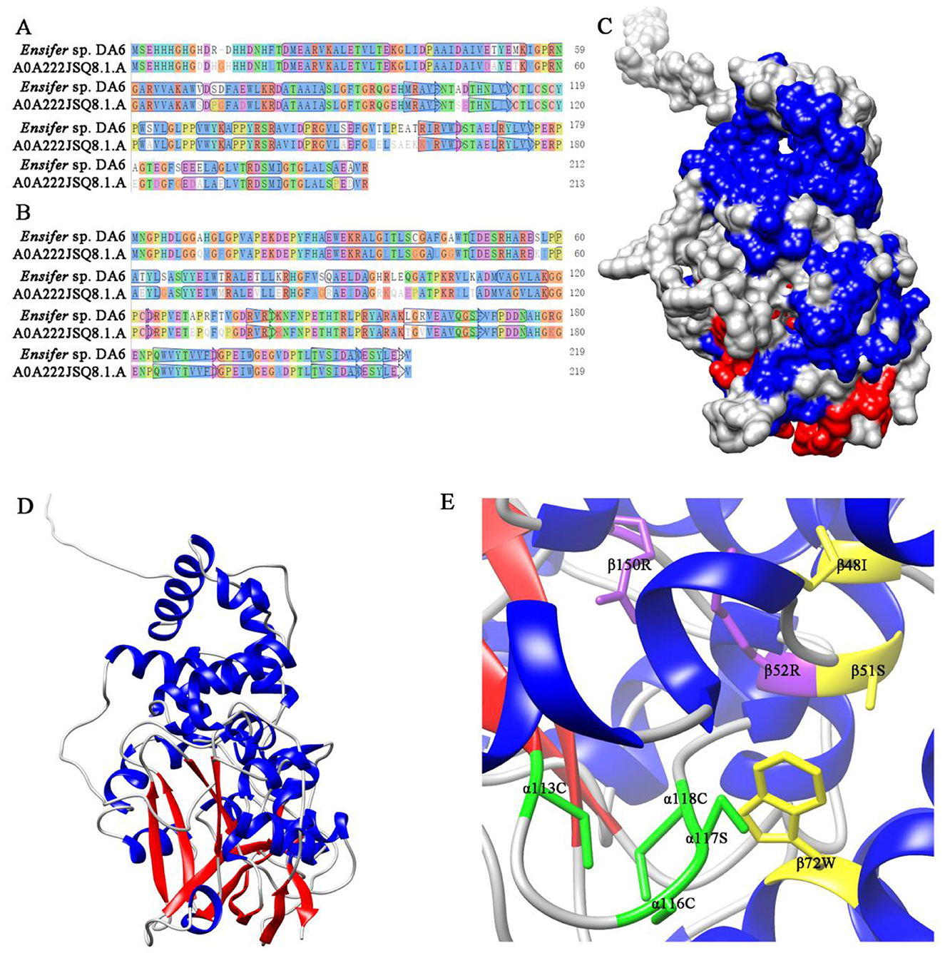 Protein sequence alignments and structural models are depicted in the image. Panels A and B show color-coded alignments of protein sequences from different species, highlighting conserved regions. Panel C displays a 3D surface model of a protein with areas marked in blue and red. Panel D features a ribbon diagram of a protein, with helices in blue and sheets in red. Panel E shows a detailed view of protein interactions, with specific residues and bonds highlighted in various colors like green and yellow.