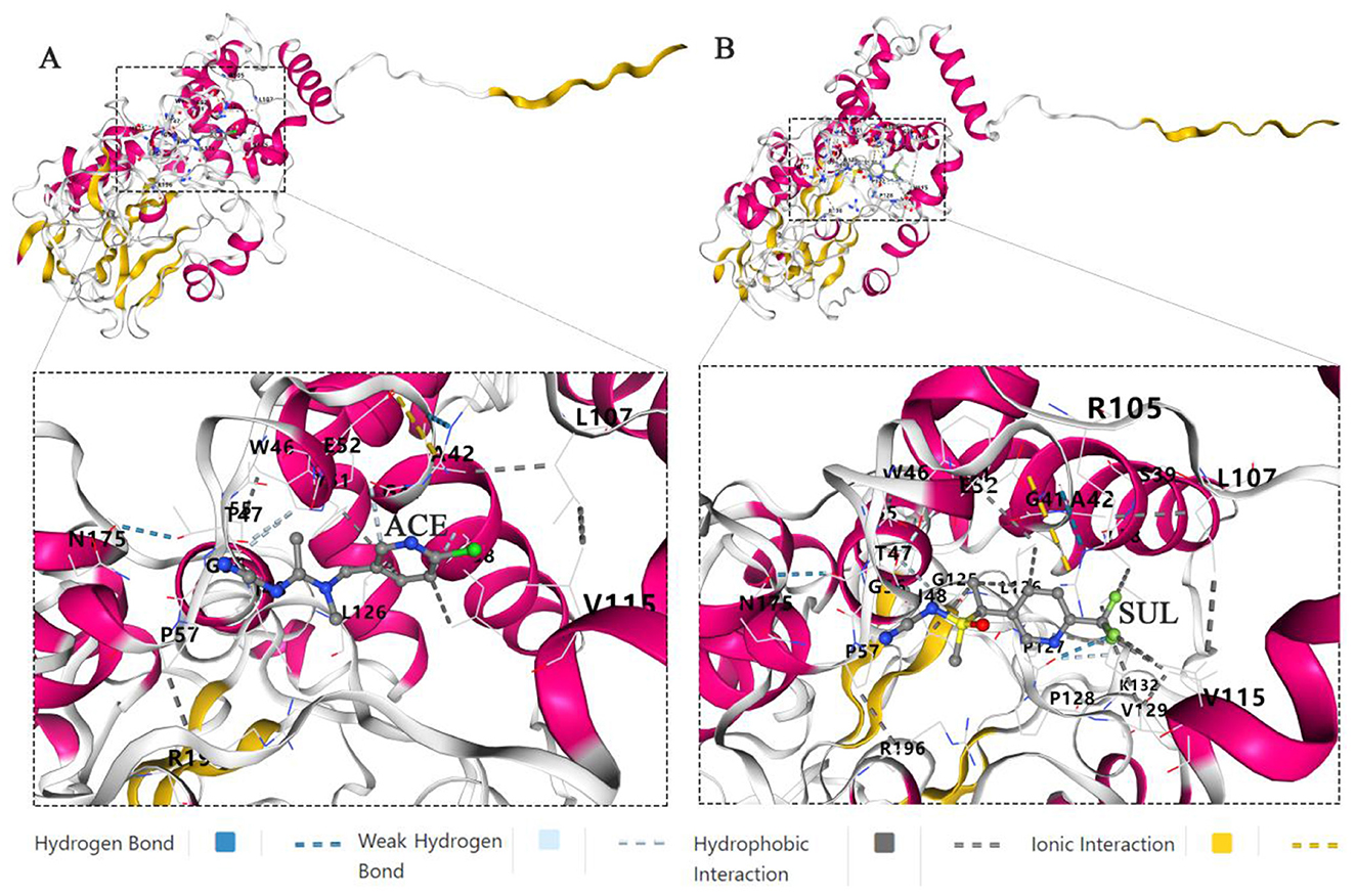 Two molecular structures labeled A and B are shown. They depict protein-ligand interactions. Pink helices and yellow strands represent secondary structures. Enlarged insets detail interactions: A highlights hydrogen bonds and hydrophobic interactions with the ligand ACE; B highlights similar interactions with the ligand SUL. Various bond types are indicated with color-coded lines and labels such as L107, P57, and V115.
