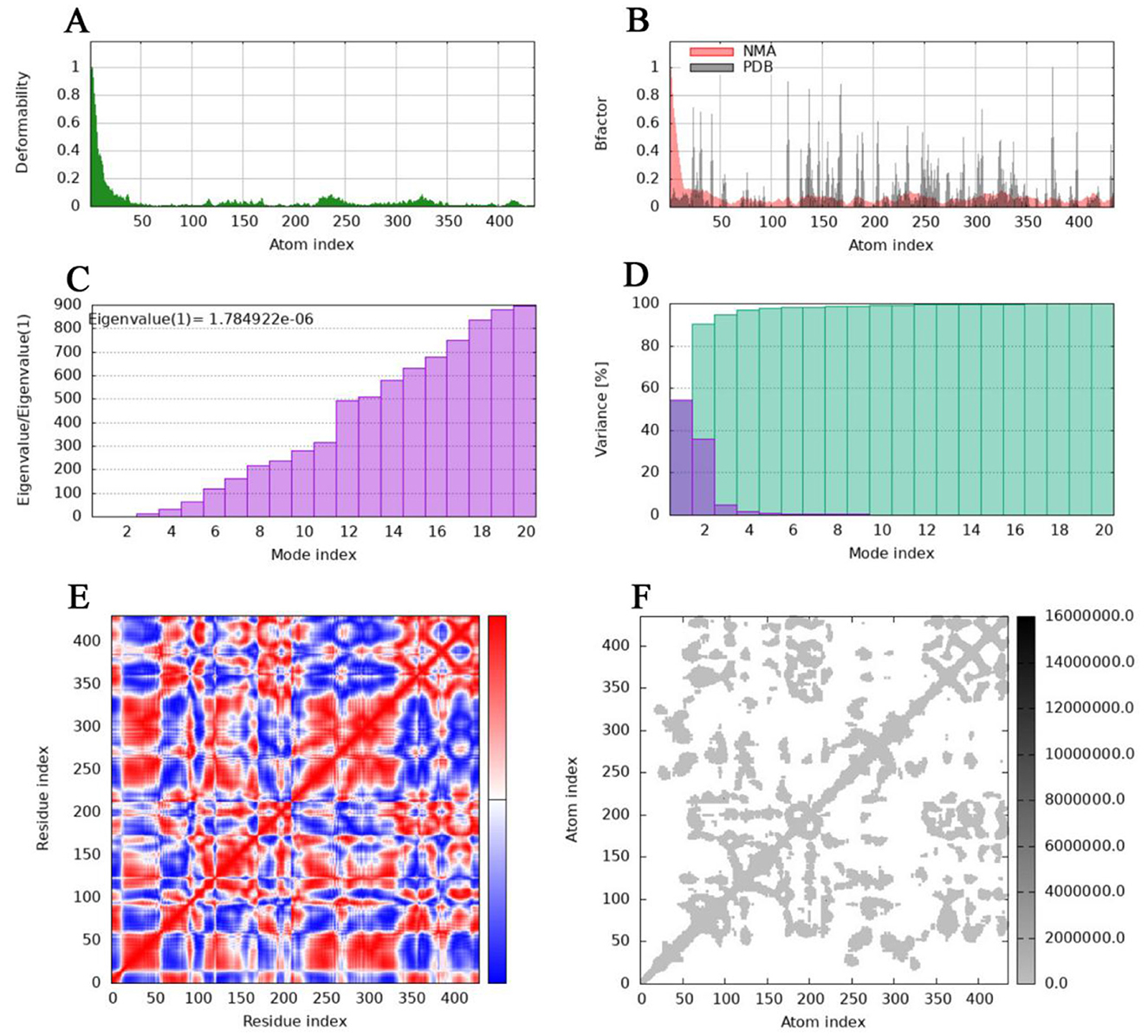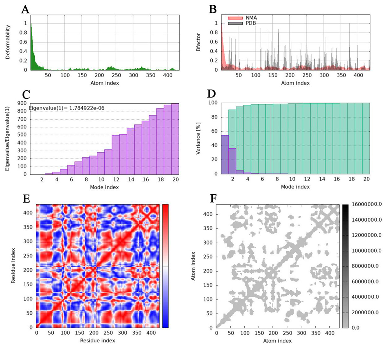 Six-panel image containing scientific charts. Panel A: Green deformability graph plotted against atom index. Panel B: B-factor comparison for NMA (red) and PDB (grey) against atom index. Panel C: Purple bar chart of eigenvalue ratios versus mode index. Panel D: Variance percentage bar chart, highlighting significant variance in initial modes. Panel E: Heat map in red and blue showing residue interaction, with residue indices on both axes. Panel F: Grey-scale interaction map displaying atom interaction intensity with atom indices on both axes.