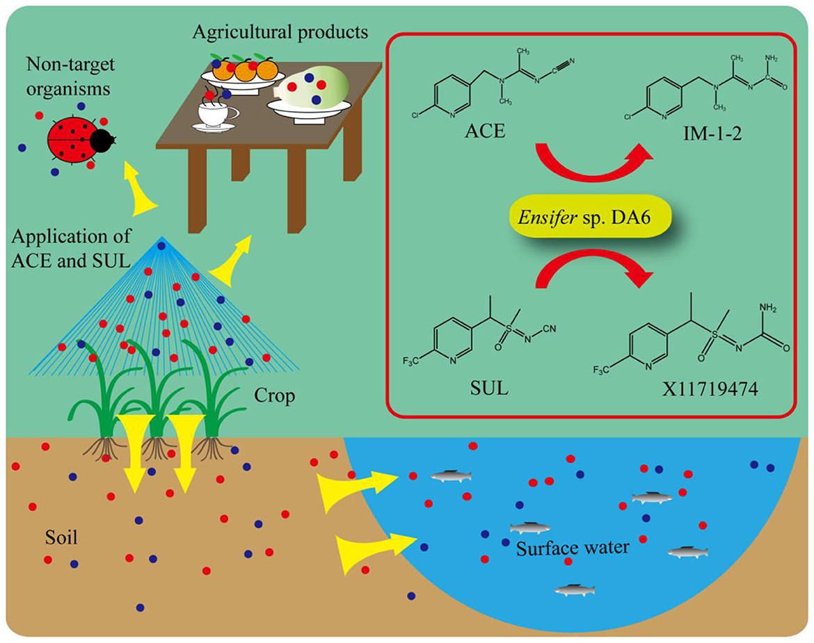 Diagram illustrating the application of ACE and SUL on crops and the resulting effects. Arrows show movement towards non-target organisms and agricultural products, as well as into soil and surface water. The top right section displays chemical structures for ACE, IM-1-2, SUL, and X11719474, with the bacterium Ensifer sp. DA6 indicated in a yellow oval, linked by arrows.