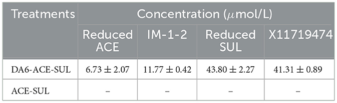 ACE, SUL, and their metabolites were analyzed using a Waters 600E HPLC system equipped with an HC-C18 column (4.6 mm × 250 mm, 5 μm; Agilent, USA). HPLC was achieved at a flow rate of 1.0 mL/min using a mobile phase comprising water containing 0.01% (v/v) acetic acid and acetonitrile (70:30, v/v). Detection wavelengths were set at 235 nm and 220 nm.