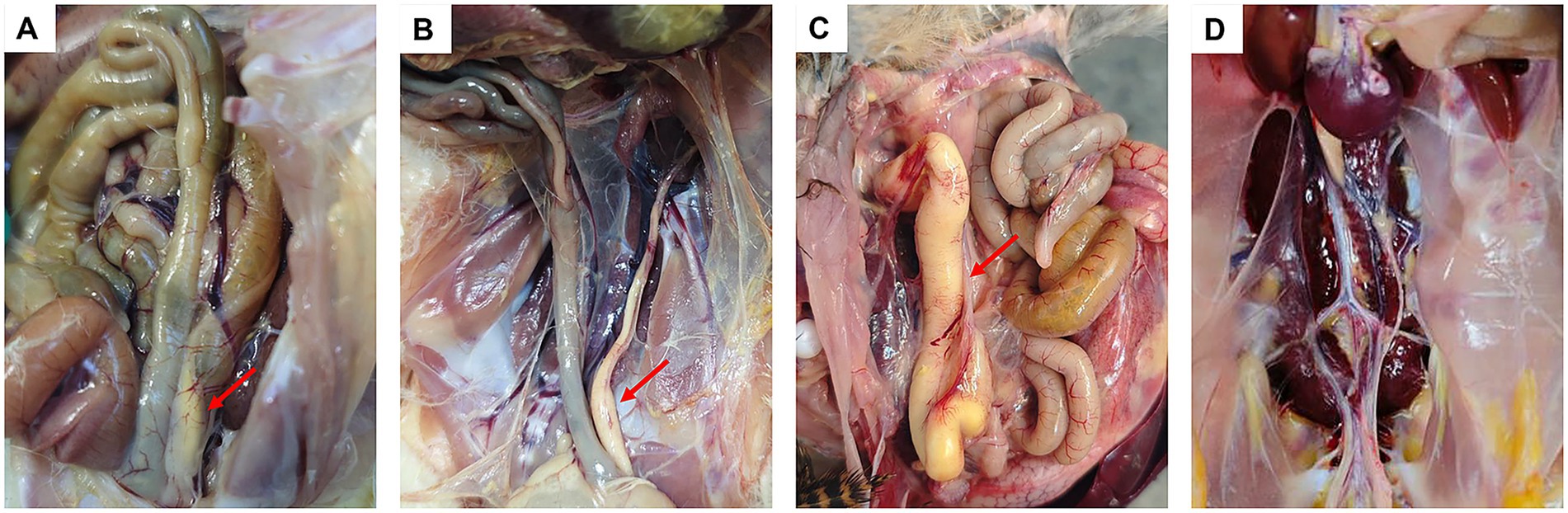 Figure 2. Pathological manifestations induced by R. anatipestifer in laying hens. Red arrows indicate sites of oviduct obstruction (A–C). Laying hens (30-day-old) infected with serotypes 1, 5, and 10 of hen strain, respectively (D). Laying hen (30-day-old) from the control group.
