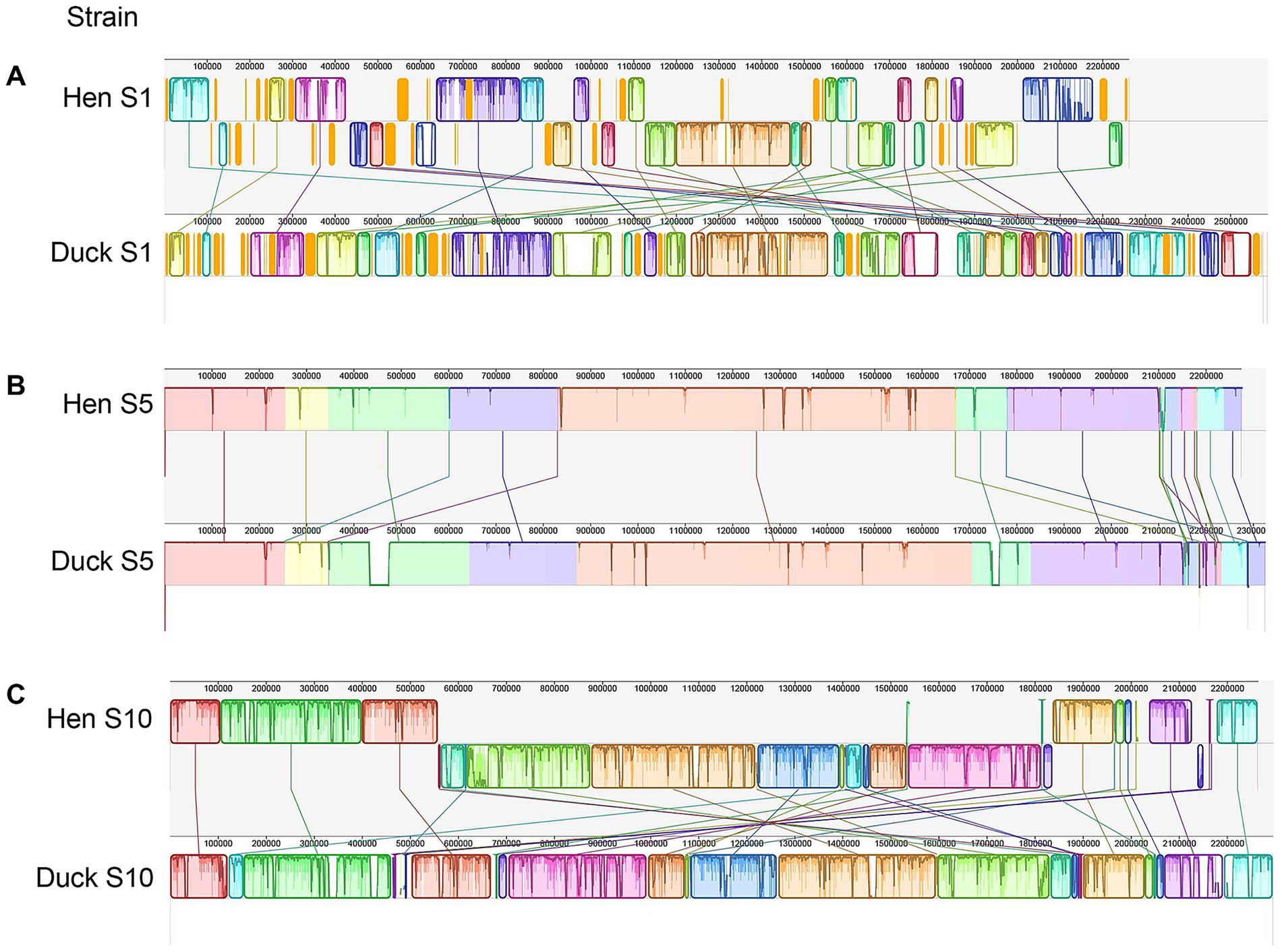 Figure 3. Comparative genomic analyses of strains isolated from hens and ducks. (A–C) Presented the comparison results between serotype 1, 5, and 10 of hen and duck strain, respectively. Each contiguously colored region is a colinear block. Lines between genomes trace each orthologous colinear block through every genome. The colinear blocks below a genome’s center line represent segments that are inverted relative to the reference genome.