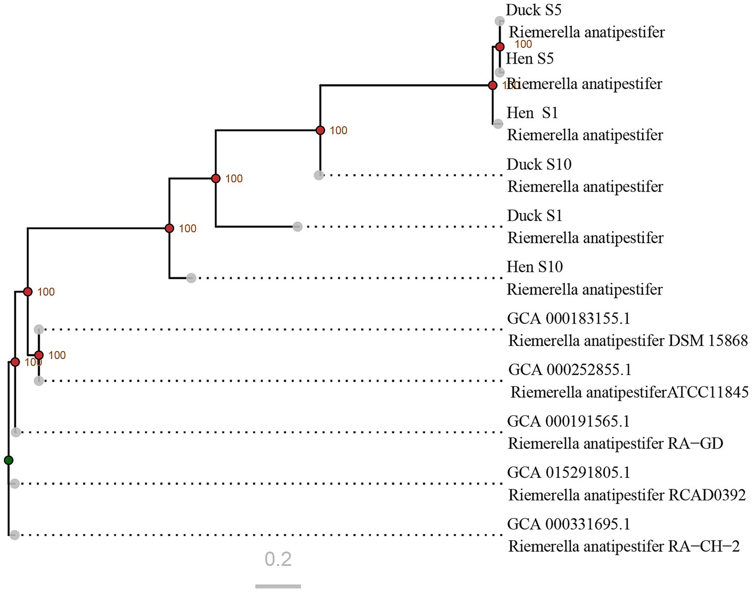 Figure 4. Phylogenetic relationships among R. anatipestifer strains based on genome-wide SNP analysis. The sequences retrieved from GenBank correspond to strains isolated between 2010 and 2020. Nodes with bootstrap values exceeding 90 are indicated by red points, whereas those with values below 70 are marked in green.