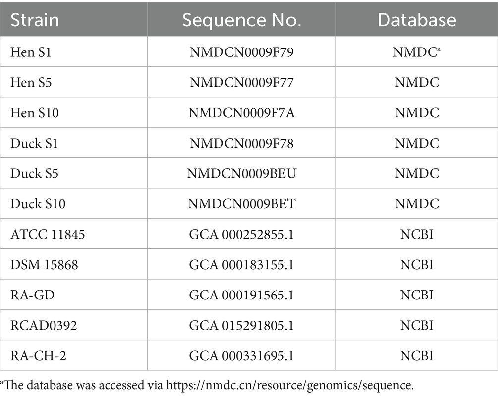 Riemerella anatipestifer antisera against serotypes 1, 2, and 7 were developed and stored by Qilu Animal Health Products Co., Ltd. using licensed vaccine strains (Production License No.: Veterinary Drug Production License (2013) 150252216), while serotypes 5 and 10 were identified by Sichuan Agricultural University (Liu et al., 2023). R. anatipestifer serotypes 1, 5, and 10 isolated from ducks have been thoroughly identified (Lyu et al., 2023) and stored in our laboratory (Table 1). Laying hens (30, 60 and 90-day-old) were obtained from Shandong Anchi Agriculture and Animal Husbandry Technology Group Co., Ltd. and individually housed in isolators under controlled temperature conditions with ad libitum access to feed and water.