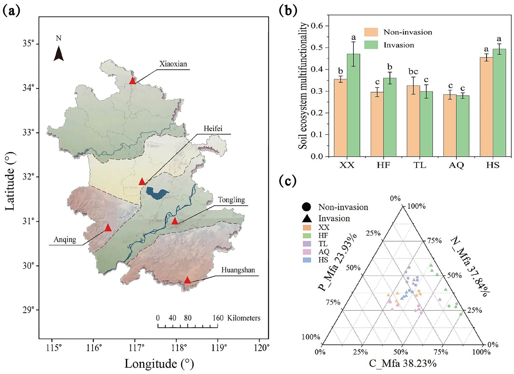 Invasive alien plants have attracted increasing global attention due to their profound impacts on terrestrial biodiversity and stability (Lai et al., 2025). These impacts extend to key ecosystem processes, like biogeochemical cycling. For instance, the invasion of Ligustrum in the Andes significantly accelerated biomass accumulation in successional forests, thereby enhancing carbon sequestration (Nguyen et al., 2020). At a broader scale, a global meta-analysis revealed that invasive plants could exhibit higher rhizosphere nitrogen mineralization rates, greater soil available nitrogen content, and increased activity of nitrogen-releasing enzymes compared with native species, ultimately enhancing soil nitrogen cycling (Negesse et al., 2025). In addition to altering carbon and nitrogen dynamics, invasive species could influence phosphorus turnover. For example, Bidens pilosa showed approximately 30% higher alkaline phosphomonoesterases activity in the rhizosphere than native plants, directly promoting the decomposition of organic phosphorus (Sun et al., 2022). While such studies provide valuable insights into individual soil element cycling function, they often overlook the reality that ecosystems operate through multiple, interconnected and trade-off functions. Understanding how these functions occur simultaneously is essential for capturing the full complexity of ecosystem responses. Collectively, biogeochemical cycling serves as a fundamental basis for ecosystem functions, underpinning processes such as productivity, nutrient turnover, and carbon sequestration. EMF provides an integrative framework to evaluate these processes, enabling a more comprehensive assessment of invasion consequences by capturing both trade-offs and synergies among ecosystem functions. This system-level perspective not only links community structural changes with ecosystem processes but also offers valuable guidance for ecosystem management and restoration under invasion pressure. Yet, comprehensive evaluations of EMF that incorporate multiple, interrelated soil functions are still lacking, leaving the ecosystem-level consequences of plant invasion poorly understood. Addressing this knowledge gap, the present study examines how plant invasion affects soil EMF by integrating multiple biogeochemical and microbial properties, thereby providing a comprehensive assessment of ecosystem responses to invasion.