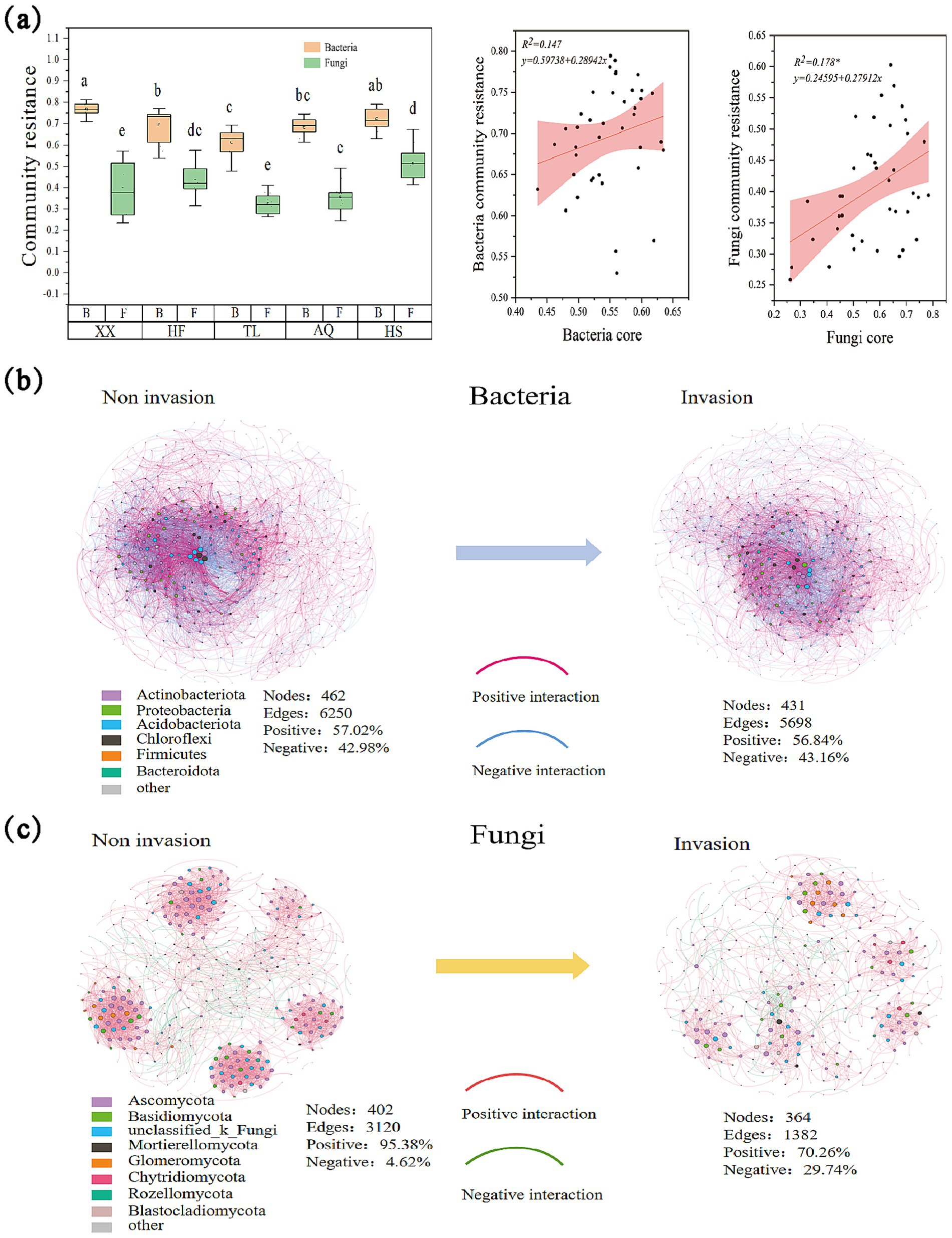 Our results showed that bacterial communities exhibited stronger resistance than fungal communities across regions (Figure 2a), consistent with previous findings (Delgado-Baquerizo et al., 2016; Jiao et al., 2022). This difference likely reflects contrasting ecological strategies: bacteria, with denser interaction networks and greater interspecies connectivity (Figure 2b), form cooperative and functionally versatile assemblages (Wang et al., 2022; Zhang et al., 2018). These relationships, coupled with high metabolic flexibility, enable rapid adjustment to environmental fluctuations (Wang et al., 2022), enhancing resistance to invasion-driven disturbances. In contrast, fungi often occupy narrower niches and rely on more specialized resource-use strategies, which slow their responses to change and reduce short-term contributions to community resistance (Chen et al., 2020; Jing et al., 2015).