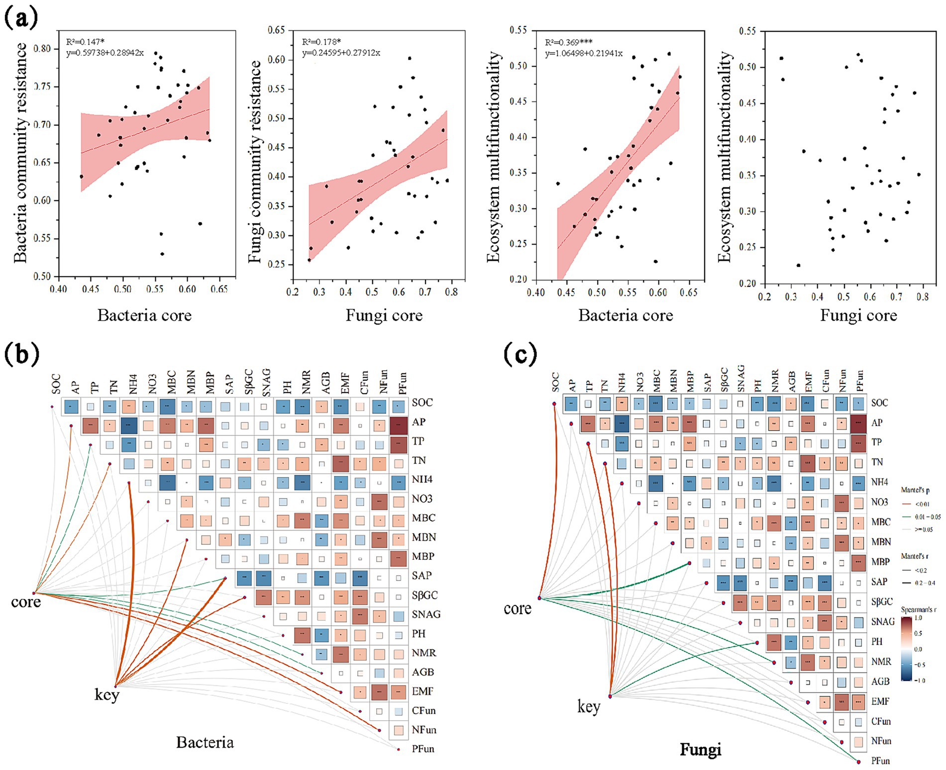 Figure 3. Linking bacterial and fungal core, key taxa and ecosystem multifunctionality. (a) The regression analysis between bacterial and fungi core, key taxa and environmental factors; (b) The correlation between bacterial core taxa and community resistance and EMF. Line width corresponds to the partial Mantel’s r statistic. Pairwise comparisons of environmental factors are also shown, with a color gradient denoting Pearson’s correlation coefficient. Asterisks indicate the statistical significance (***p < 0.001; **p < 0.01; and *p < 0.05), the same below; (c) The correlation between fungal core taxa and community resistance and EMF.
