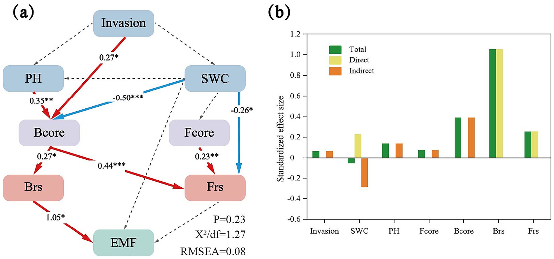 Figure 4. (a) Structural equation modeling (SEM) assessing the effects of Invasion, PH, SWC (soil water content), B and Fcore (bacterial and fungal core taxa), B and Frs (bacterial and fungal community resistance) in EMF (ecosystem multifunctionality). Numbers adjacent to arrows show standardized path coefficients. Red and blue lines indicate positive and negative relationships. ***p < 0.001; **p < 0.01; and *p < 0.05. (b) Standardized total, direct and indirect effects based on the SEM for the concentrations of Invasion, PH, SWC, B and Fcore, B and Frs. The green column is the total effect, the yellow column is the direct effect, and the orange column is the indirect effect.