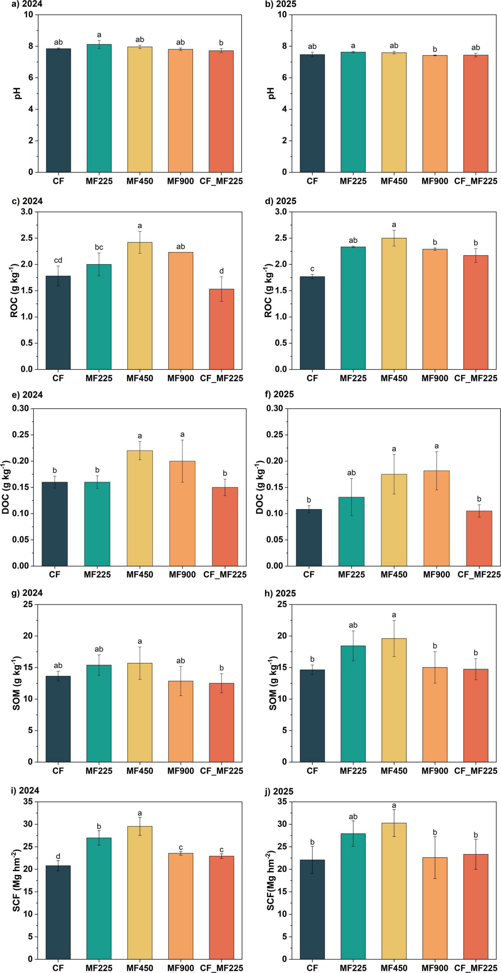 Figure 1. Effects of fertilization treatments on soil pH (a,b), readily oxidizable organic carbon [ROC, (c,d)], dissolved organic carbon [DOC, (e,f)], soil organic matter [SOM, (g,h)], and soil carbon sequestration [SCF, (i,j)] in 2024 and 2025. Different letters indicate significantly different values (P < 0.05).