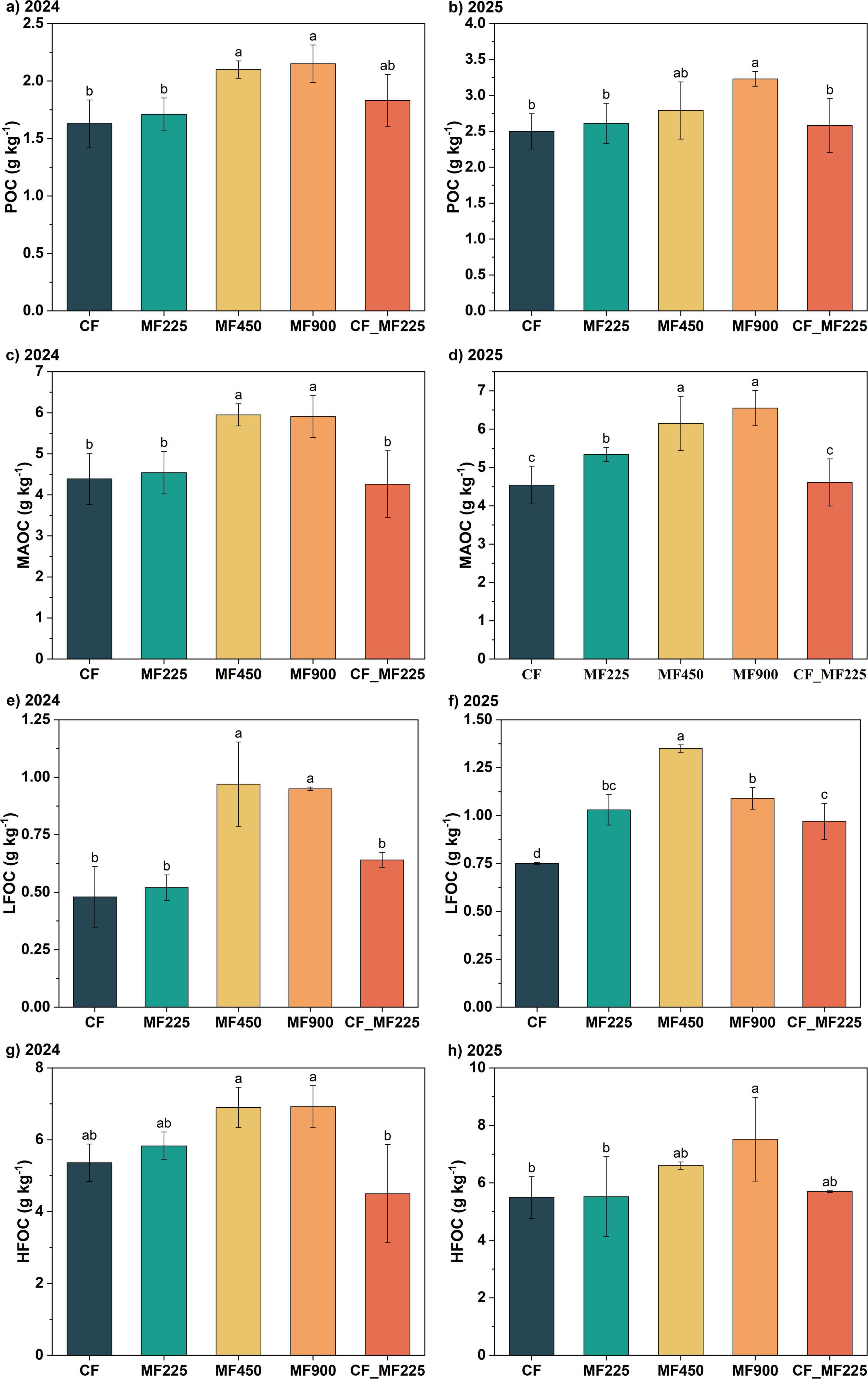 Figure 2. Effects of fertilization treatments on particulate organic carbon [POC, (a,b)], mineral-associated organic carbon [MAOC, (c,d)], light-fraction organic carbon [LFOC, (e,f)], and heavy-fraction organic carbon [HFOC, (g,h)] in 2024 and 2025. Different letters indicate significantly different values (P < 0.05).