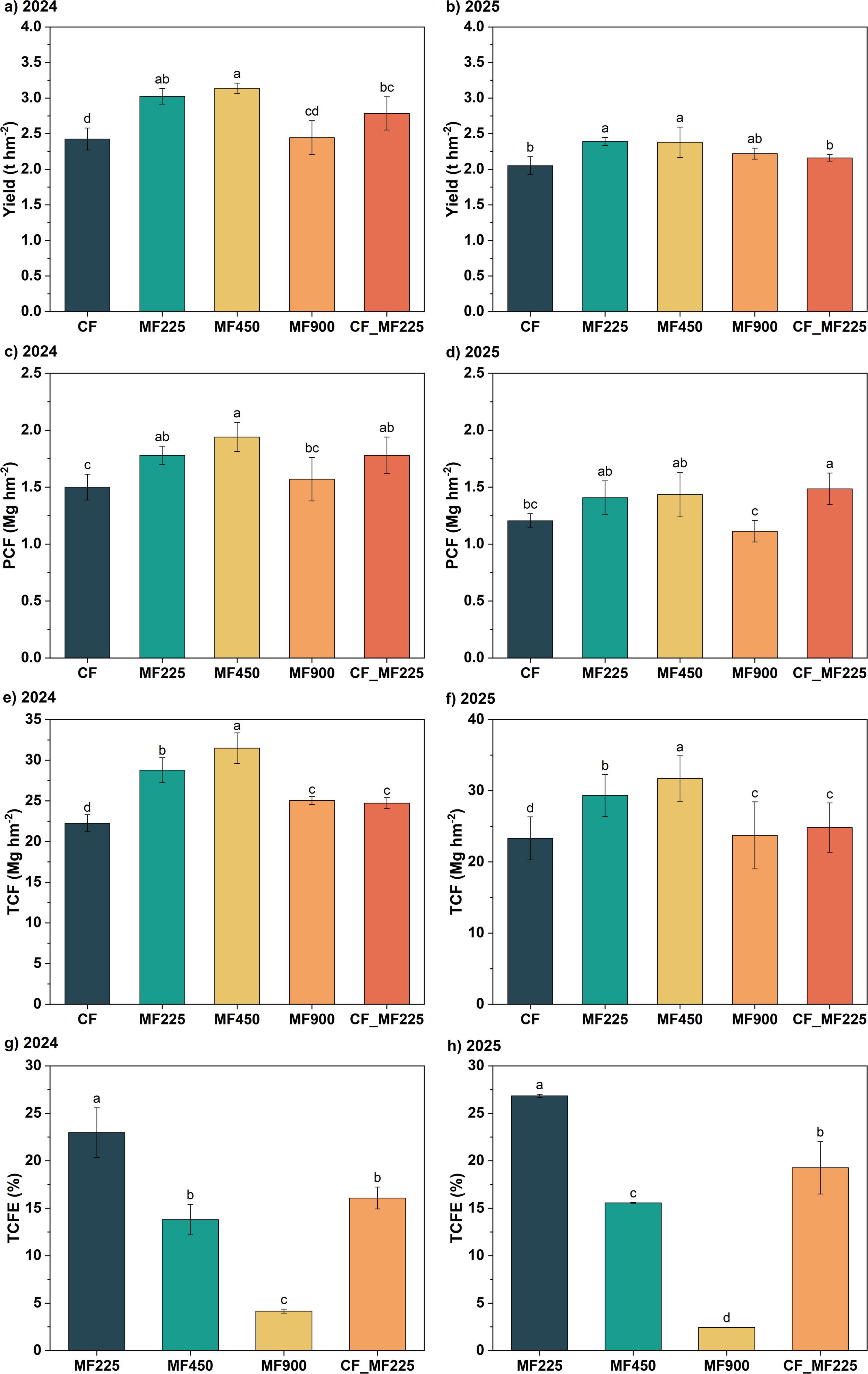 Figure 3. Effects of fertilization treatments on yield (a,b), plant carbon fixation [PCF, (c,d)], total carbon fixation [TCF, (e,f)], and total carbon fixation efficiency [TCFE, (g,h)] in 2024 and 2025. Different letters indicate significantly different values (P < 0.05).