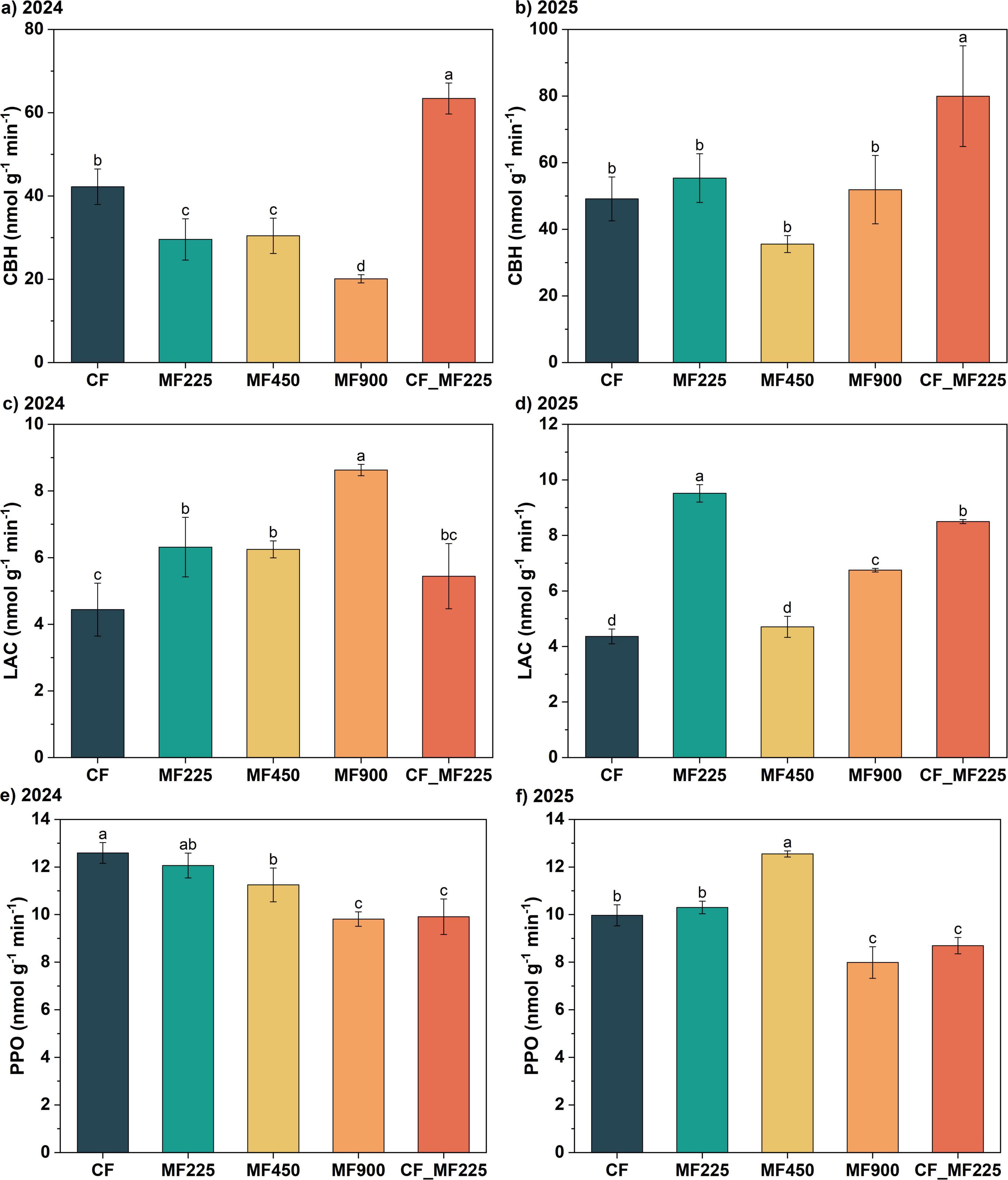 Figure 4. Effects of fertilization treatments on cellobiohydrolase [CBH, (a,b)], laccase [LAC, (c,d)], and polyphenol oxidase [PPO, (e,f)] activities in 2024 and 2025. Different letters indicate significantly different values (P < 0.05).