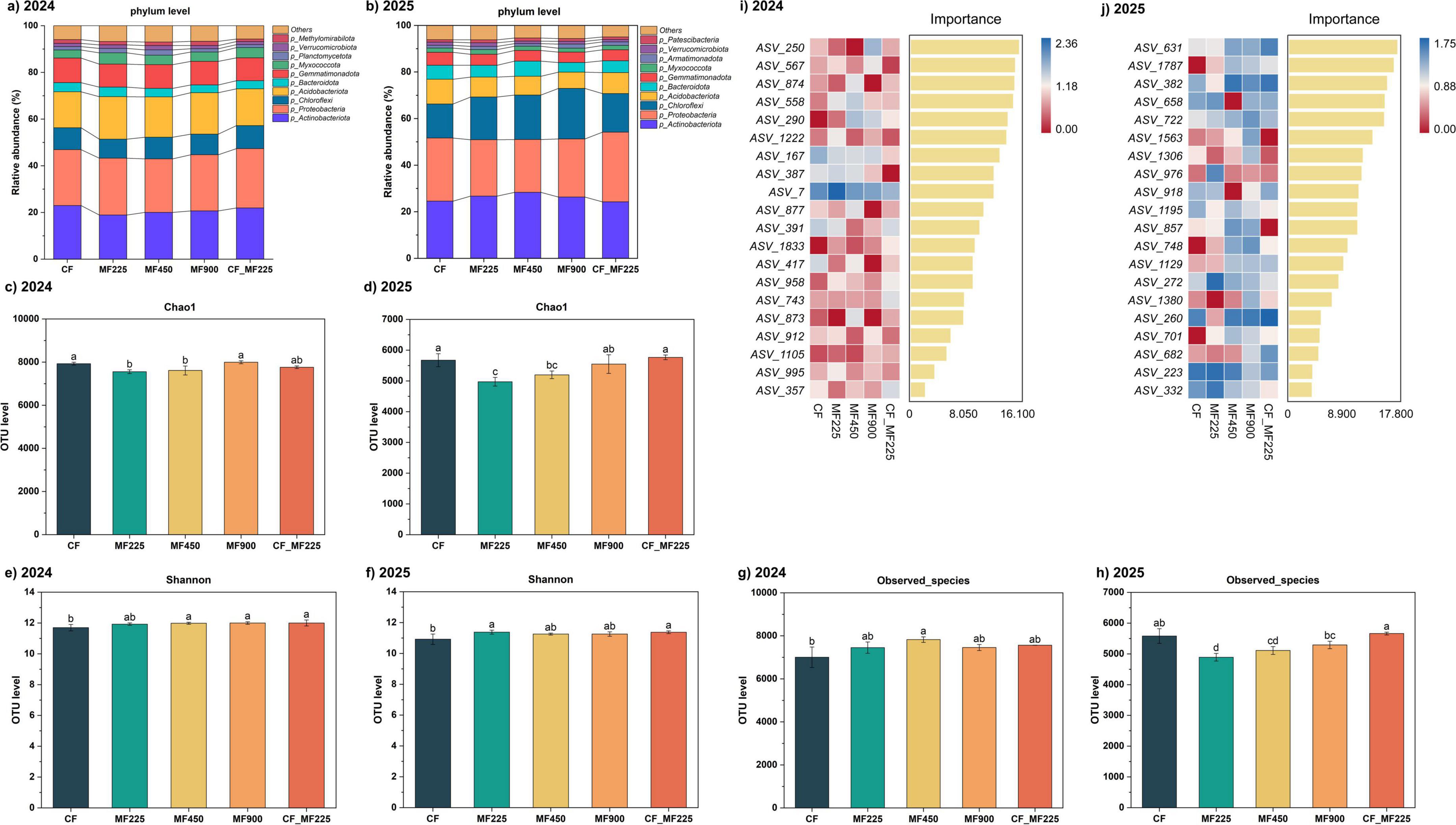 Figure 5. Effects of fertilization treatments on microbial community and diversity indices in 2024 and 2025. Microbial community structure and species composition (a,b), Chao1 index (c,d), Shannon index (e,f), observed species richness (g,h), and random forest analysis of top discriminant ASVs (i,j), showing heatmap-based relative abundances and random forest importance scores, with the color scale indicating standardized abundance: blue = high, red = low). Different letters indicate significantly different values (P < 0.05).