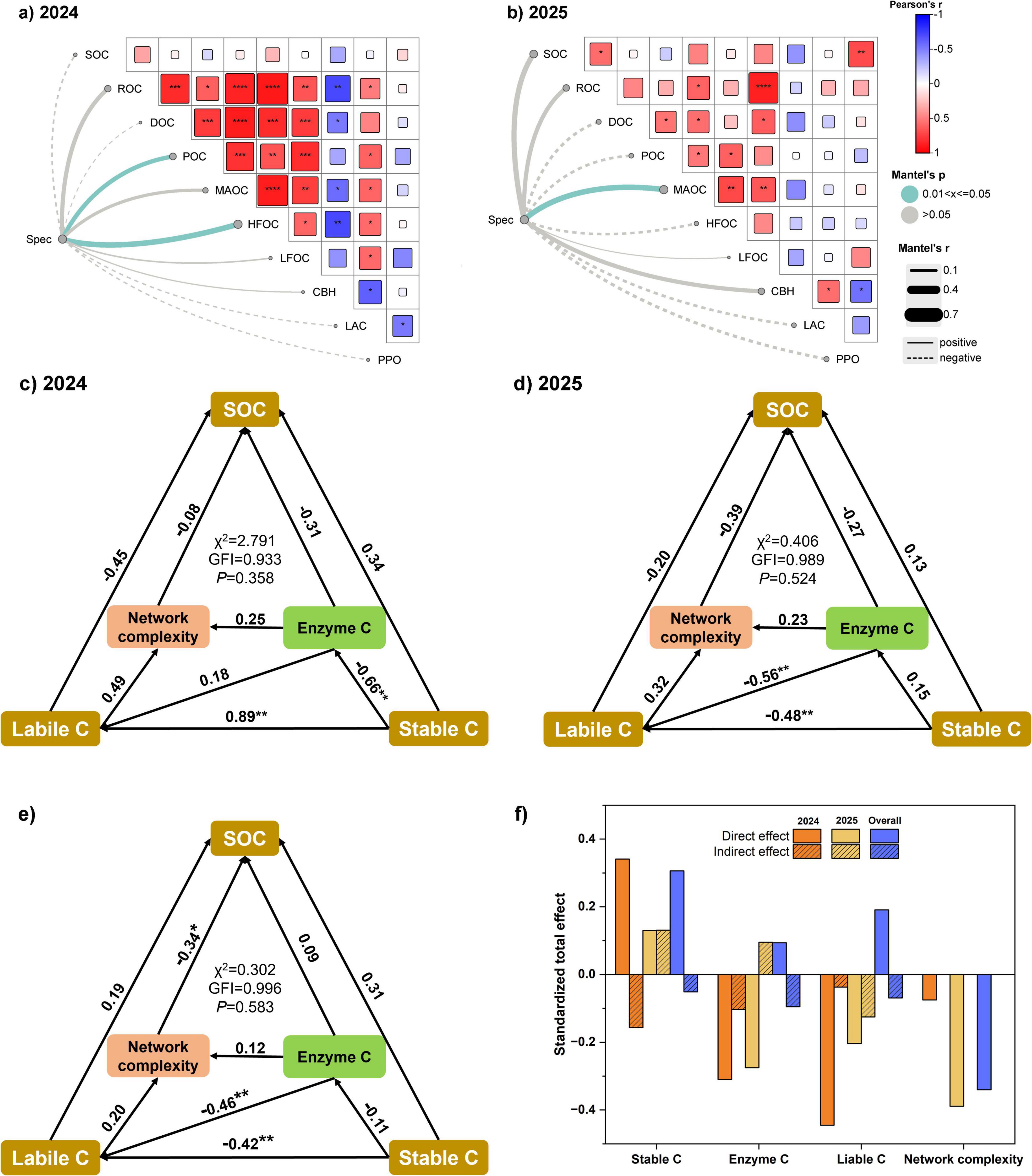 Figure 6. Relationships between soil properties, microbial diversity, and soil organic carbon (SOC) accumulation as revealed by Mantel test and structural equation modeling (SEM) in 2024, 2025, and their overall combination. (a,b) Show Mantel test results linking bacterial community composition at the genus level (Spec) with soil physicochemical indicators in 2024 and 2025, respectively. (c–e) Present SEM pathways for SOC accumulation in 2024, 2025, and the overall dataset, with numbers on arrows indicating standardized path coefficients. *, **, ***, and **** denote significance at p < 0.05, p < 0.01, p < 0.001, and p < 0.0001, respectively. Labile C and Stable C represent labile and stable carbon fractions, Enzyme C indicates carbon-cycle-related enzyme activities, and Network complexity denotes microbial co-occurrence network complexity. GFI refers to the goodness-of-fit index. (f) Summarizes the standardized total effects (STE) of different factors on SOC, partitioned into direct and indirect effects for 2024, 2025, and the overall combination.