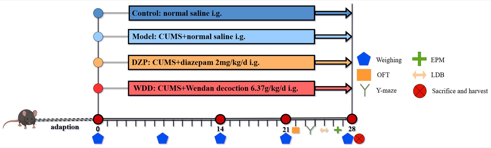 Six-week-old male C57BL/6 J mice weighing 18–22 g were acquired from Beijing HFK Bio-Technology Co., Ltd., (Animal Production Licence No.: SCXK (Beijing) 2024–0003). The mice were acclimatized for 1 week in a specific pathogen-free (SPF) facility (ambient temperature maintained at 22 ± 1 °C, relative humidity at 55 ± 5%, under an automated light cycle of 12:12 h) with unlimited access to food and water. After acclimatization, mice were weighed and randomly divided into four distinct groups: (1) the control group (Con), (2) the CUMS model group (CUMS), (3) CUMS+diazepam (DZP) group (DZP), (4) CUMS+WDD group (WDD), with 10 mice per group, and each mouse housed in the separate cage. Over 28 days, the Con group received standard food and water, while mice in CUMS, DZP, and WDD groups were subjected to nine different CUMS stressors, following a protocol adapted from Wang et al. (2020). Detailed stressor schedules were provided in Supplementary material 1. Animal experiment procedures were approved by the Laboratory Animal Welfare and Ethics Committee of Henan University of Chinese Medicine (Approval No. IACUC-202410038).