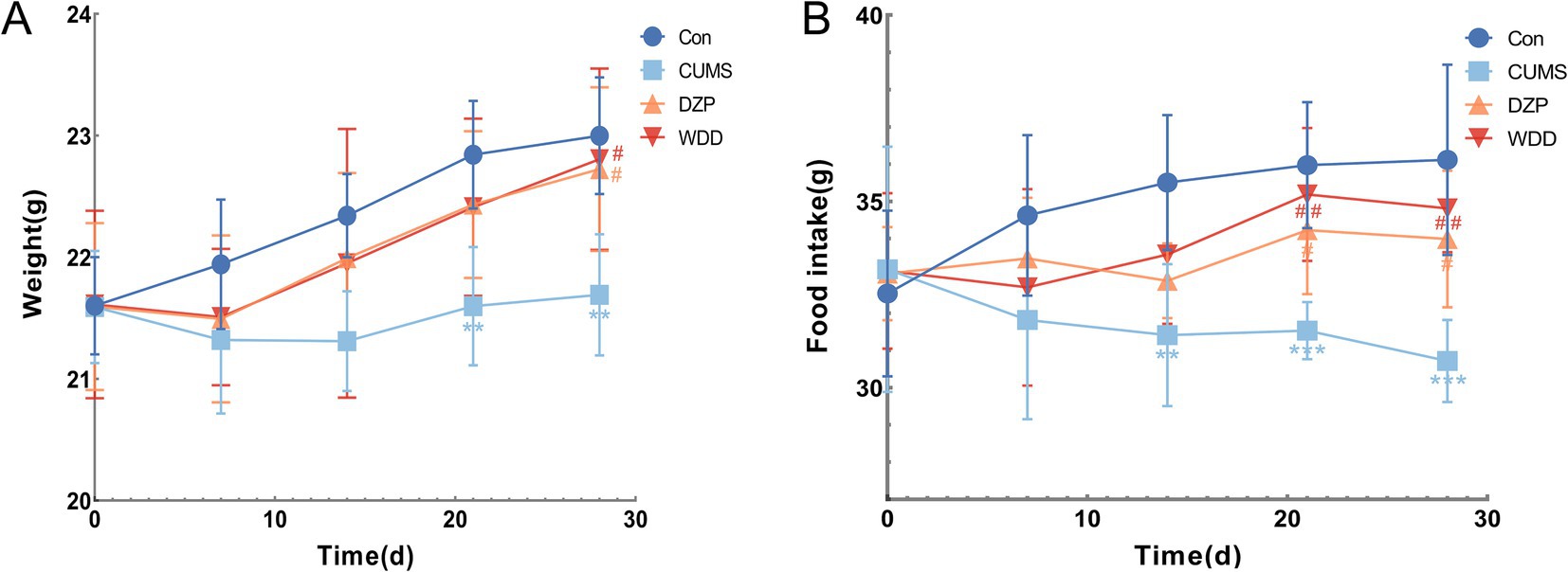 Figure 2. Effects of WDD on body weight and food intake in CUMS-induced mice. (A) Weekly body weight of mice in each group (n = 6). (B) Weekly food consumption of mice in each group (n = 6). **p < 0.01, ***p < 0.001 vs. Con group; #p < 0.05, ##p < 0.01 vs. CUMS model group.